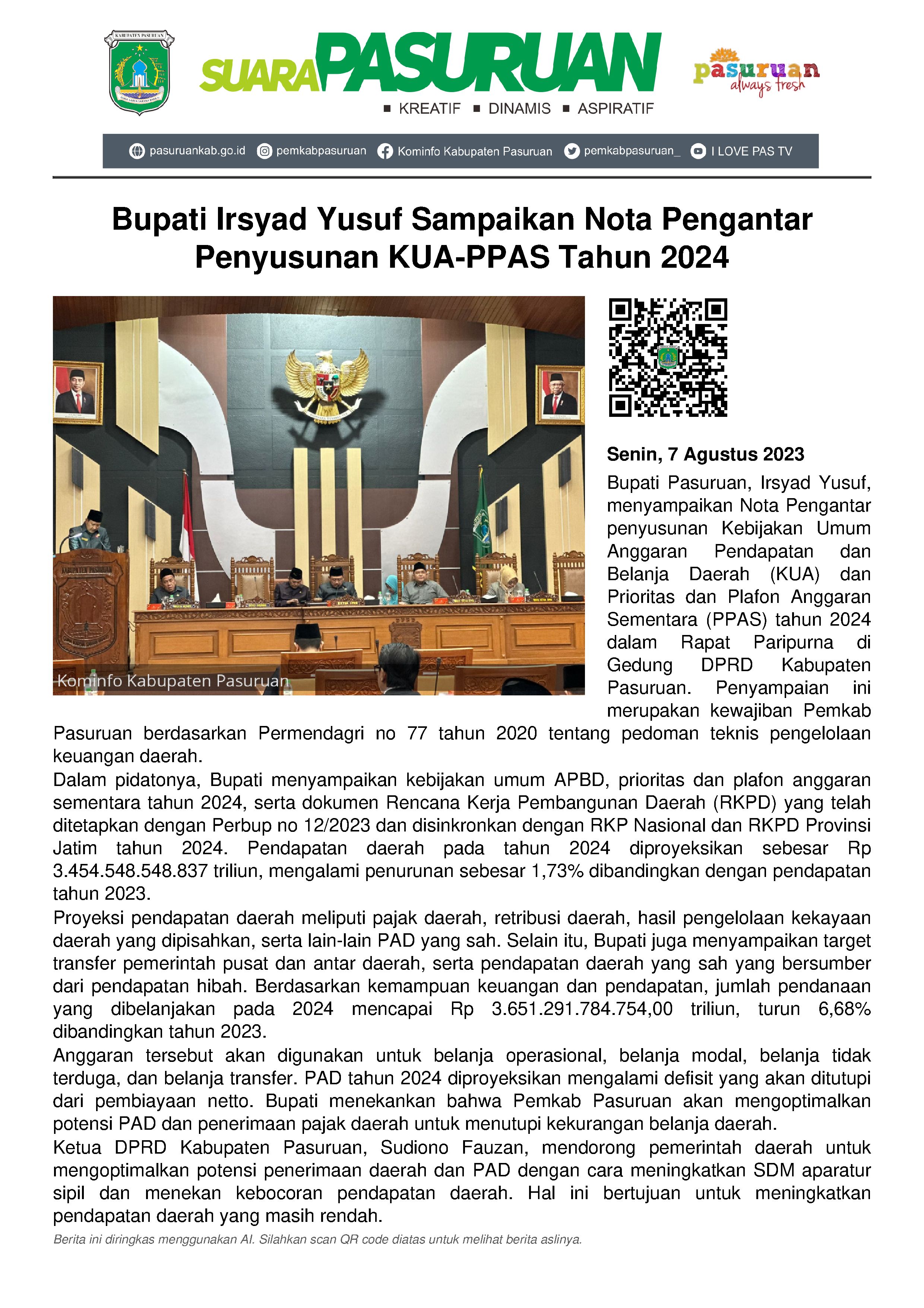 "Sudah jadi kewajiban Pemkab Pasuruan untuk menyampaikan nota pengantar penyusunan KUA-PPAS untuk tahun 2024 mendatang, dan kami sampaikan hari ini," kata Bupati, sesaat setelah rapat paripurna selesai digelar.