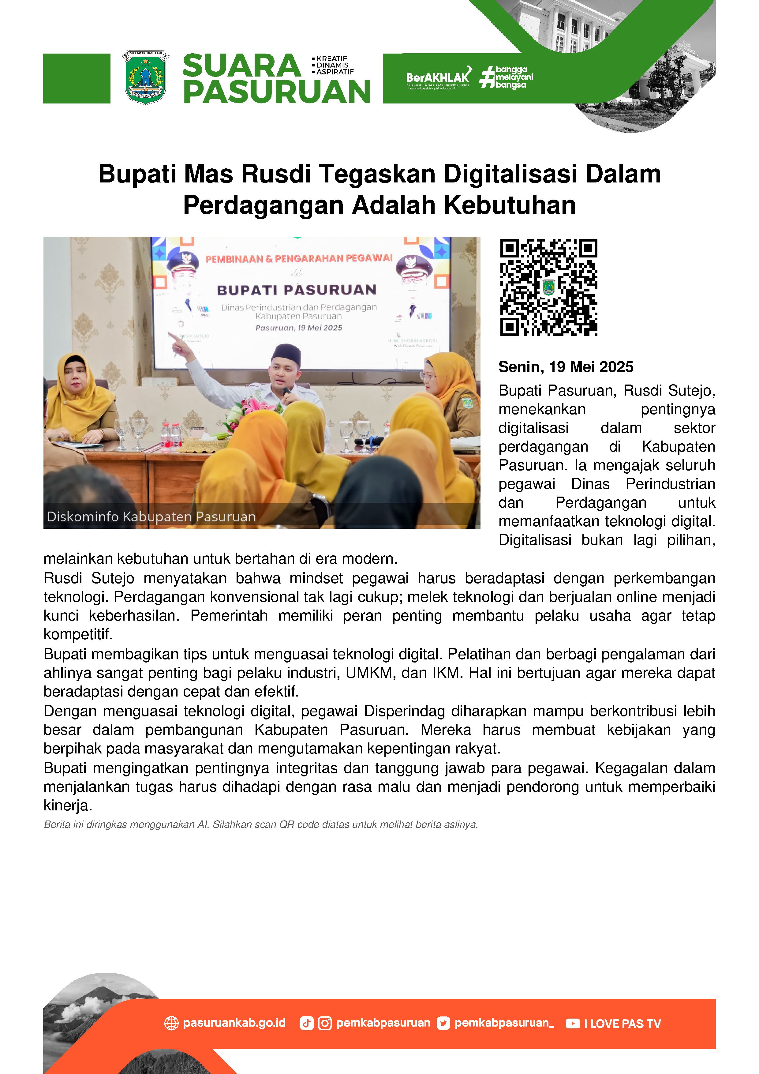 Bupati Pasuruan, Rusdi Sutejo mengajak seluruh pegawai agar betul-betul memanfaatkan digitalisasi dalam urusan perdagangan.