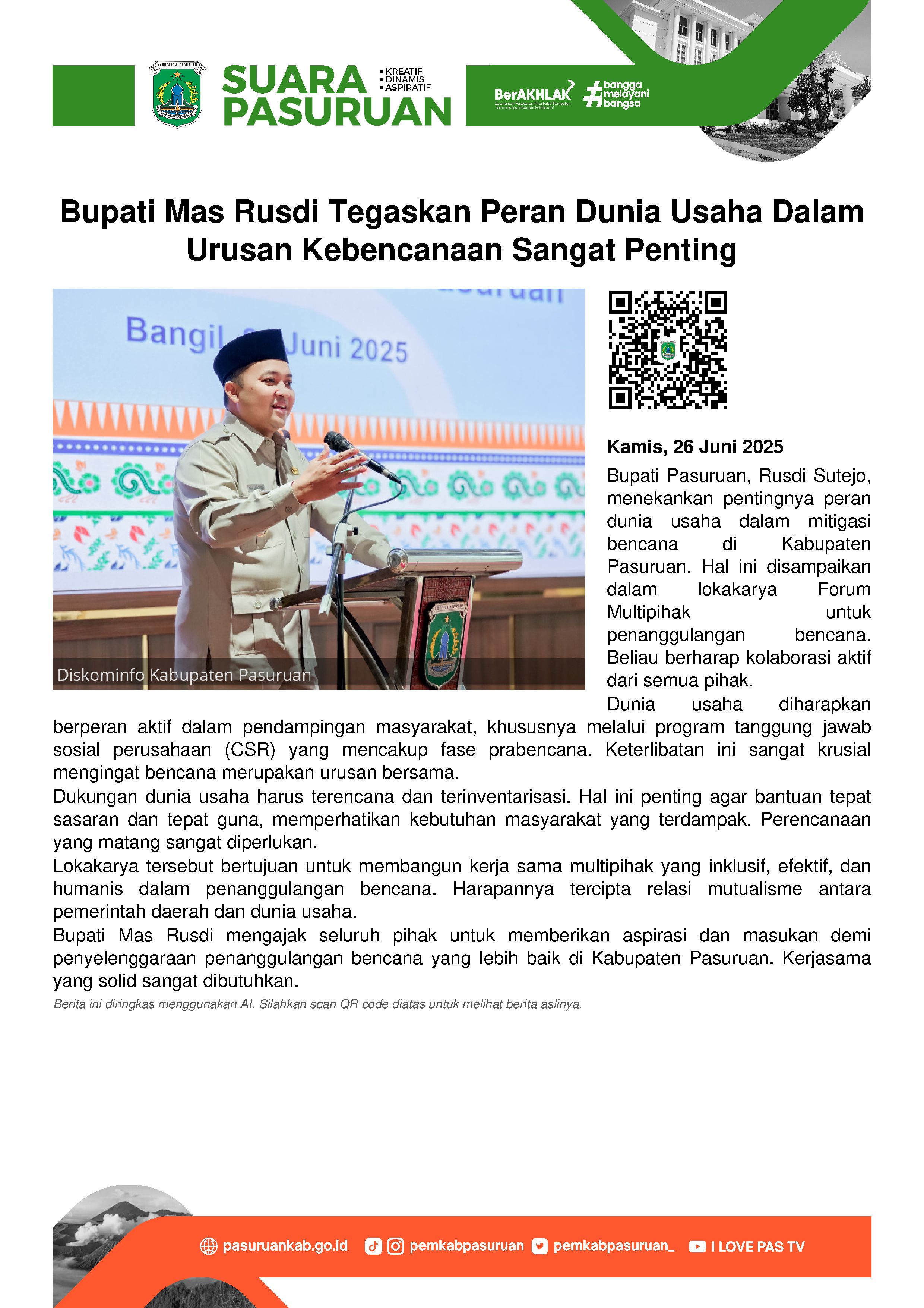 Penekanan tersebut ia sampaikan di hadapan sejumlah perwakilan perusahaan yang hadir dalam acara Lokakarya Forum Multipihak untuk penanggulangan bencana di Kabupaten Pasuruan, di Auditorium Mpu Sindok, Komplek Kantor Bupati Pasuruan, Kamis (26/6/2025) pagi.