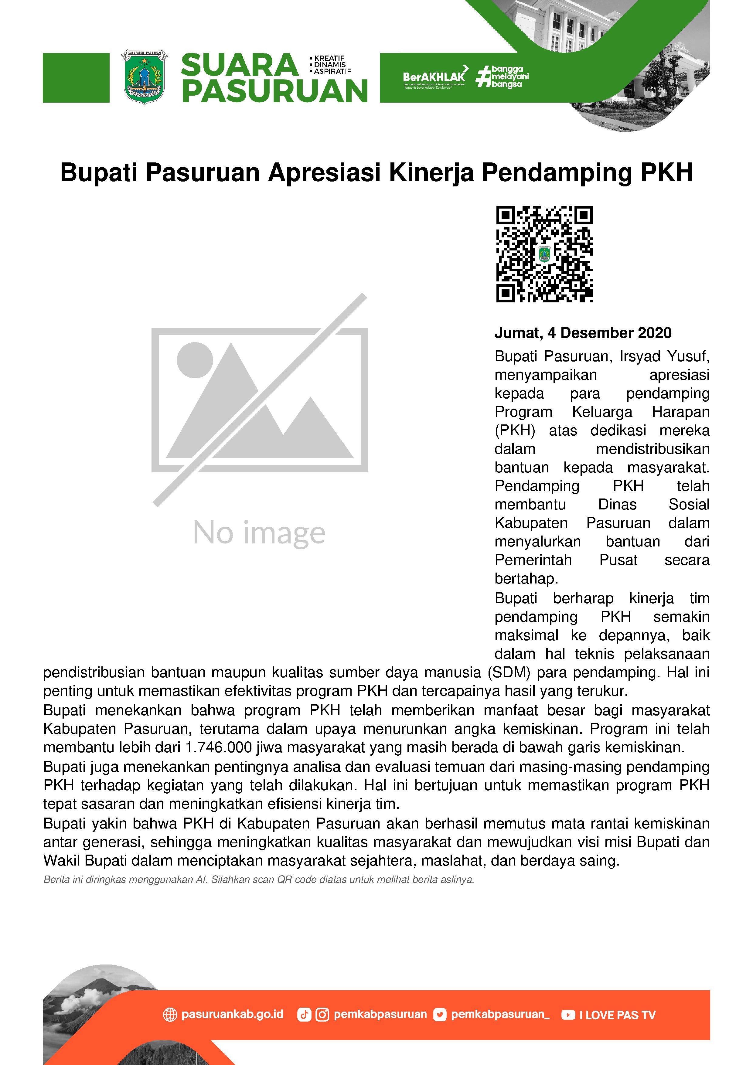 Bupati Pasuruan, Irsyad Yusuf mengapresiasi dedikasi seluruh para pendamping Program Keluarga Harapan (PKH) yang selama ini telah berkontribusi dalam mendistribusikan bantuan kepada masyarakat. Sehingga memudahkan Organisasi Perangkat Daerah (OPD) terkait yakni Dinas Sosial Kabupaten Pasuruan dalam menyalurkan bantuan dari Pemerintah Pusat yang dilakukan secara bertahap.