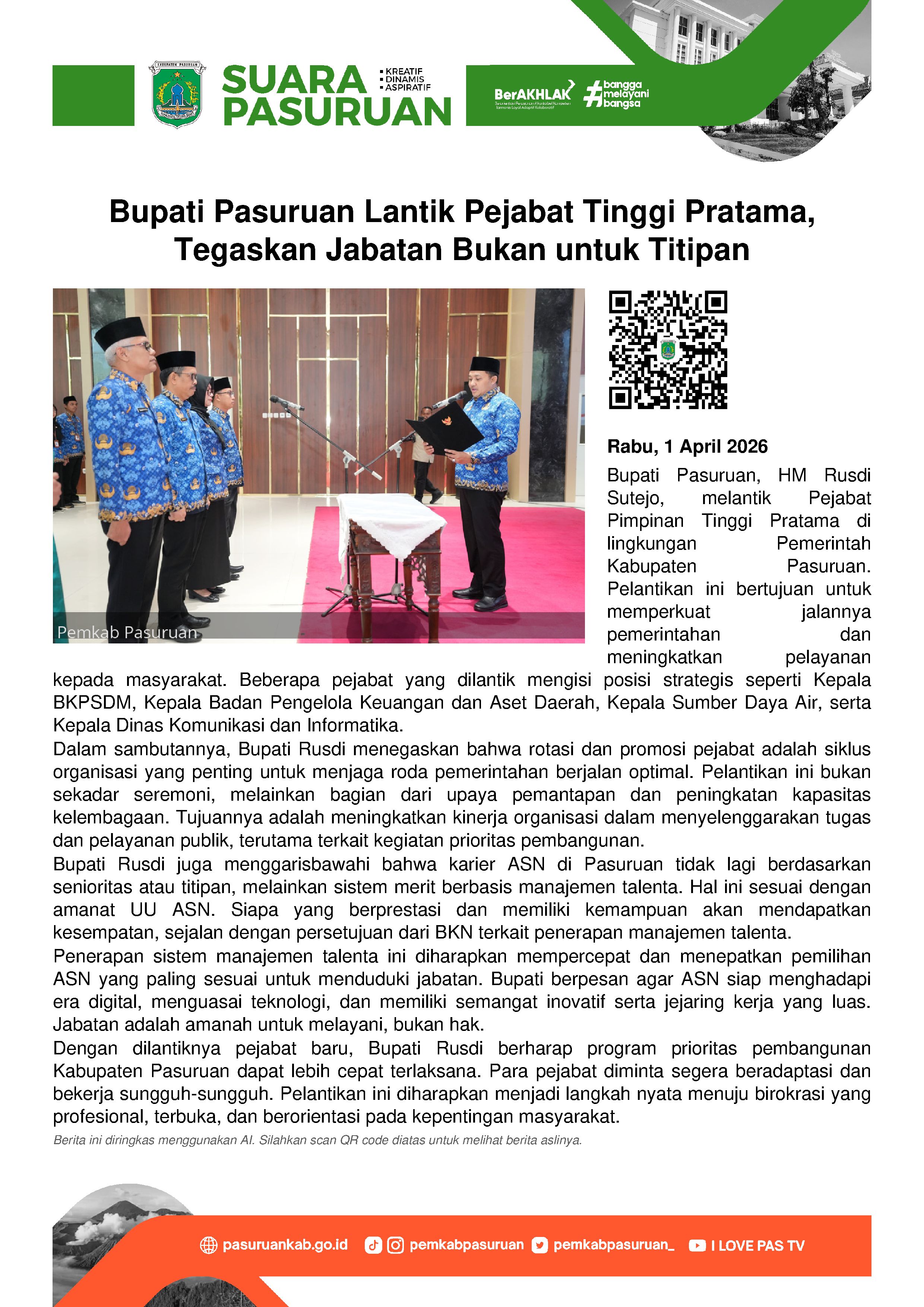 Bupati Pasuruan, HM Rusdi Sutejo melantik sejumlah Pejabat Pimpinan Tinggi Pratama di lingkungan Pemerintah Kabupaten Pasuruan, Rabu (1/4/2026). Pelantikan digelar di Auditorium Mpu Sindok, Gedung Bupati Pasuruan, dan dihadiri oleh para pejabat serta unsur pimpinan daerah. Kegiatan ini menjadi bagian dari upaya Pemkab Pasuruan untuk memperkuat jalannya pemerintahan dan meningkatkan pelayanan kepada masyarakat.