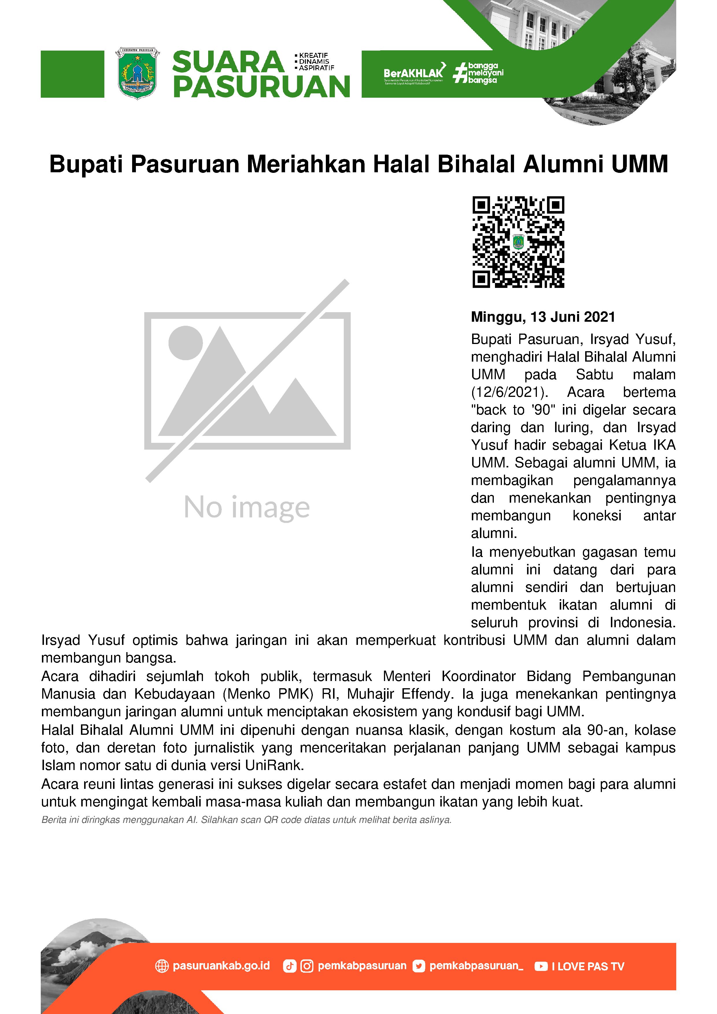 Bupati Pasuruan, Irsyad Yusuf menghadiri Halal Bihalal Alumni Universitas Muhammadiyah Malang (UMM) yang diselenggarakan pada hari Sabtu malam (12/6/2021) di UMM Dome. Keberadaannya dalam forum silaturahmi lintas generasi bertema back to ’90 yang digelar secara luring maupun daring melalui akun Youtube tersebut menambah semarak suasana.