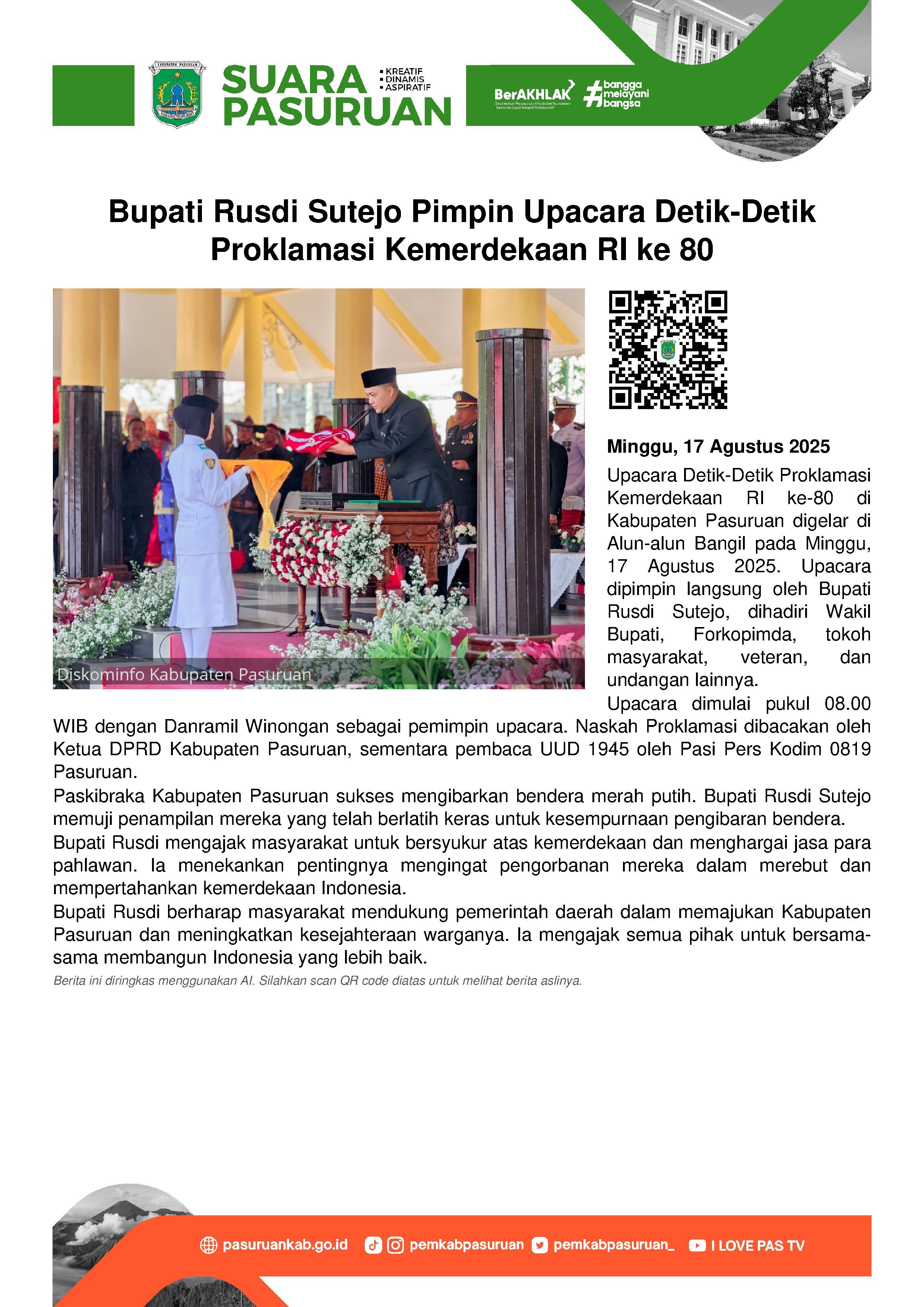 Perihal HUT Kemerdekaan RI ke 80, Mas Rusdi - sapaan akrab Bupati Pasuruan ini mengajak seluruh lapisan masyarakat agar senantiasa bersyukur. Lantaran kemerdekaan yang diraih bangsa Indonesia sejak tahun 1945 semata-mata hasil perjuangan pantang menyerah dari para pahlawan hingga mengorbankan jiwa dan raganya.