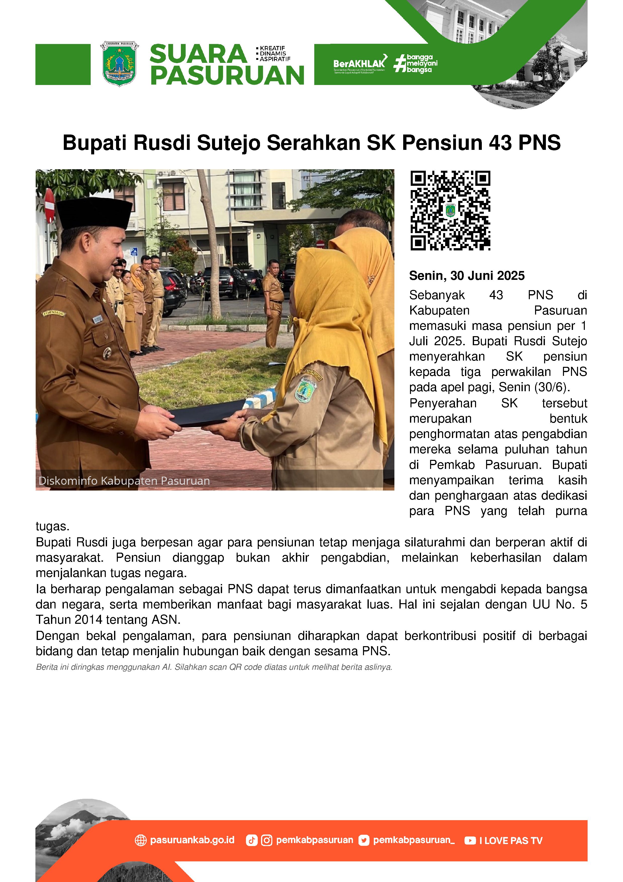 Per 1 Juli 2025, sebanyak 43 Pegawai Negeri Sipil (PNS) di Lingkungan Pemerintah Kabupaten Pasuruan memasuki masa purna tugas.