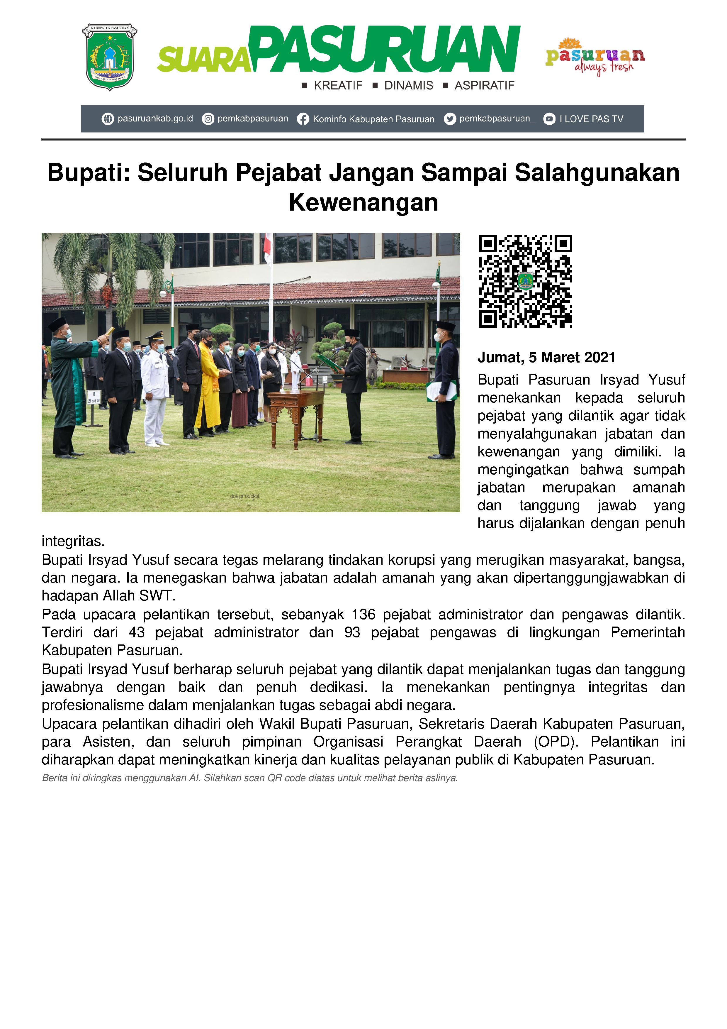 Bupati Pasuruan Irsyad Yusuf menginstruksikan kepada seluruh pejabat agar tidak bermain-main dengan sumpah jabatan. Karena pengambilan sumpah tersebut merupakan amanah sekaligus tanggung jawab yang harus dijalankan penuh tanggung-jawab. Pernyataan itu disampaikan pada saat Upacara Pelantikan dan Pengambilan Sumpah/ Janji Pejabat Administrator dan Pengawas di Lingkungan Kabupaten Pasuruan yang digelar di halaman apel Pemerintah Kabupaten Pasuruan, Jumat (5/3/2021).