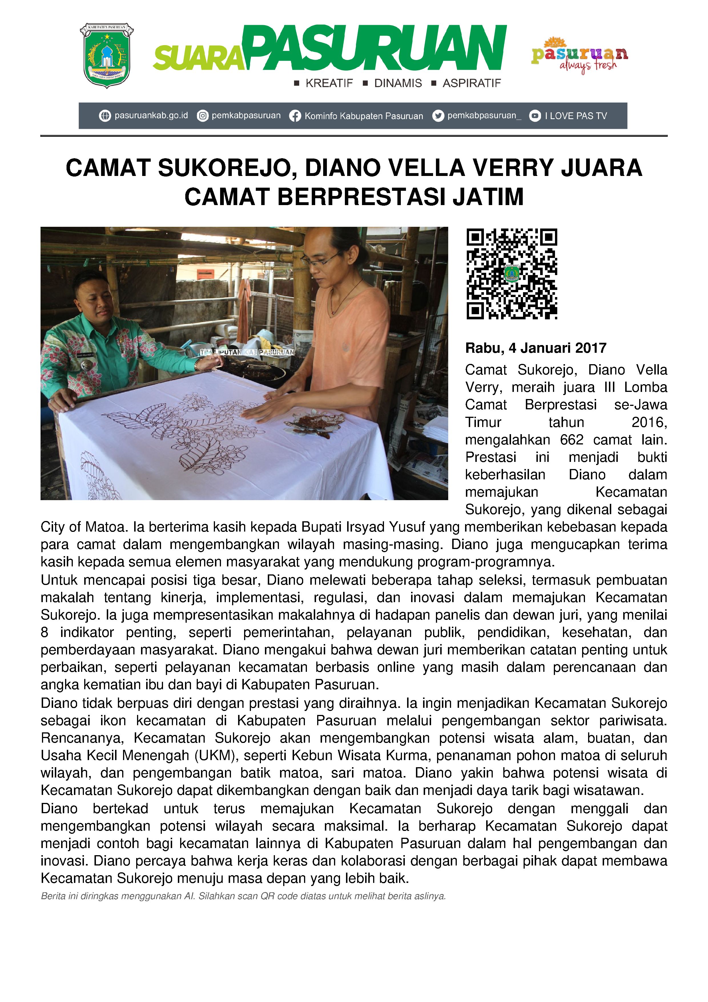 Ditemui di sela-sela kesibukannya, Rabu (04/01), Diano berterima kasih kepada Bupati Irsyad yang telah mempercayakan dirinya sebagai Camat Sukorejo, dan seluruh pihak yang membuat Kecamatan Sukorejo berbuah wajah.
