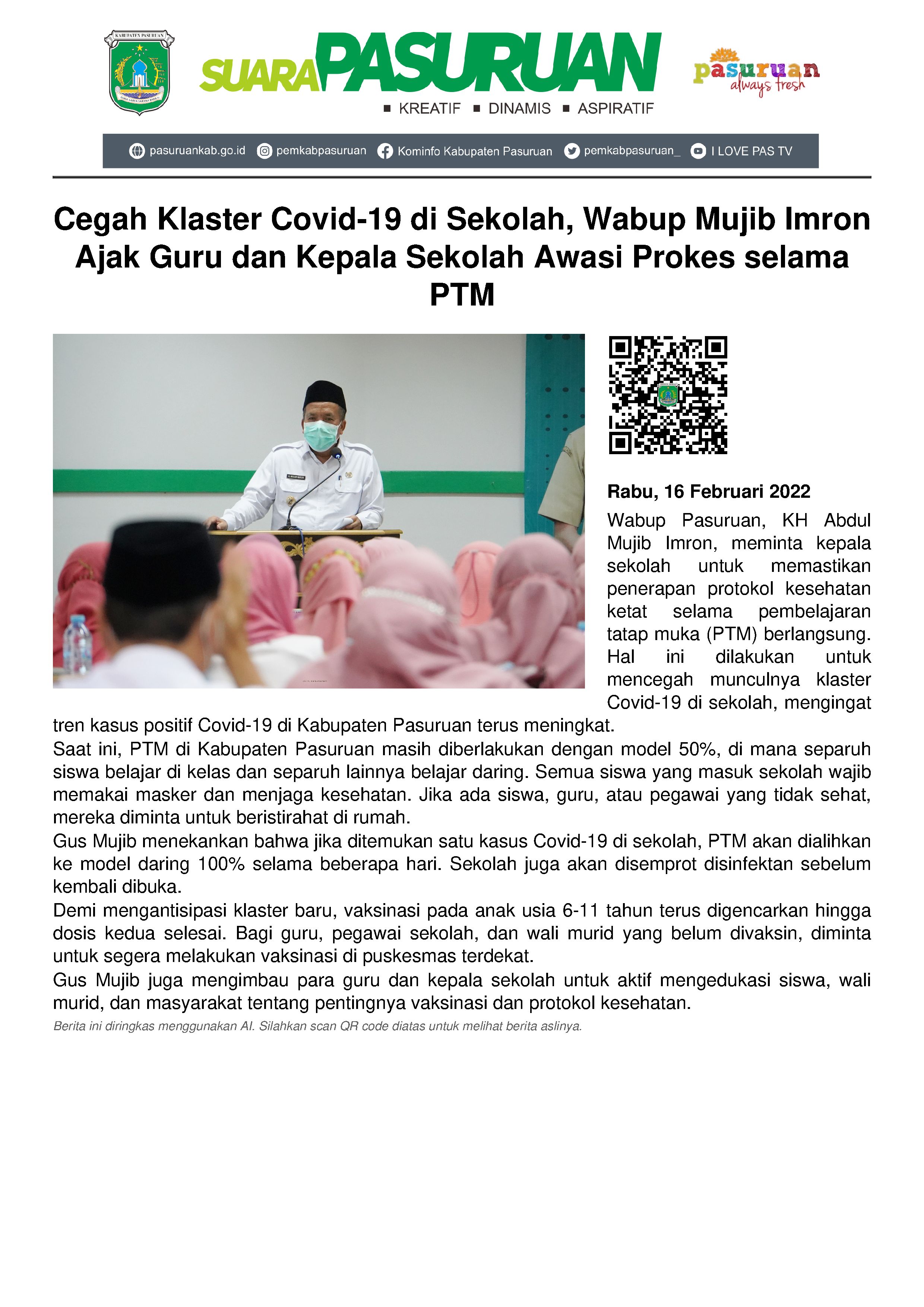 Wakil Ketua Satgas Penanganan Covid-19 Kabupaten Pasuruan, KH Abdul Mujib Imron (Gus Mujib) mengatakan, PTM yang diberlakukan masih 50%, dimana separuh dari jumlah siswa di setiap sekolah belajar di kelas dan setengahnya lagi belajar dalam jaringan (daring).