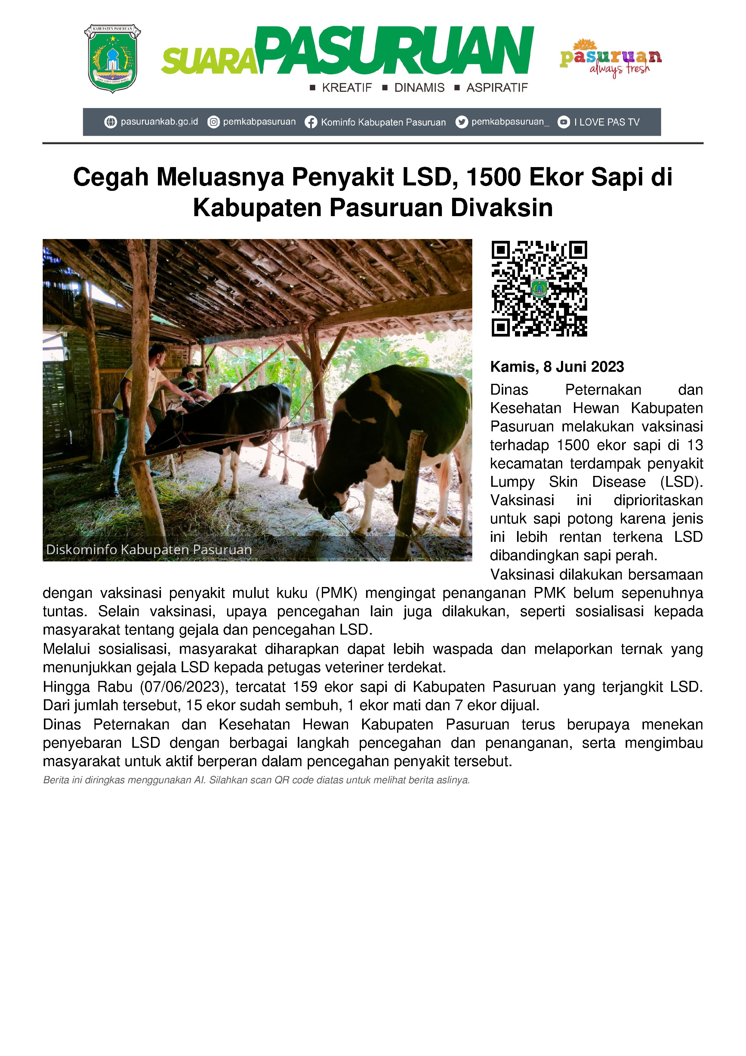 Untuk mengantisipasi semakin merebaknya penyakit Lumpy Skin Disease (LSD), Dinas Peternakan dan Kesehatan Hewan Kabupaten Pasuruan intens melakukan vaksinasi terhadap ternak sapi, kerbau dan sejenisnya.