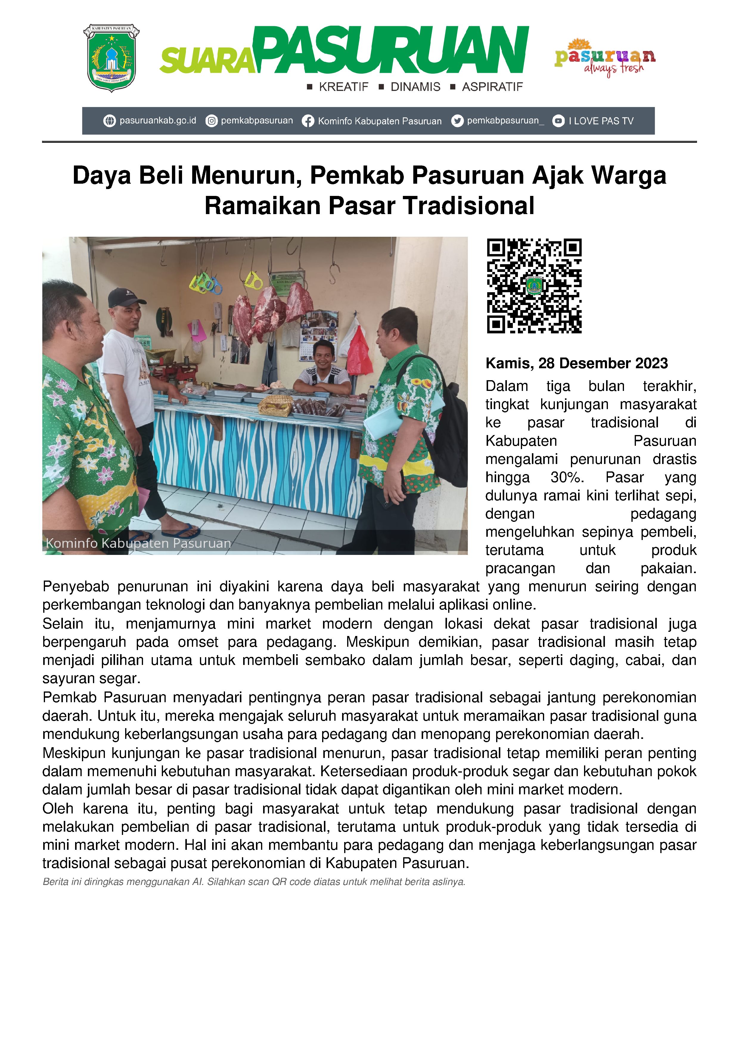 Oleh karena itu, Pemkab Pasuruan mengajak seluruh masyarakat untuk meramaikan Pasar Tradisional sebagai jantungnya perekonomian daerah. (emil)