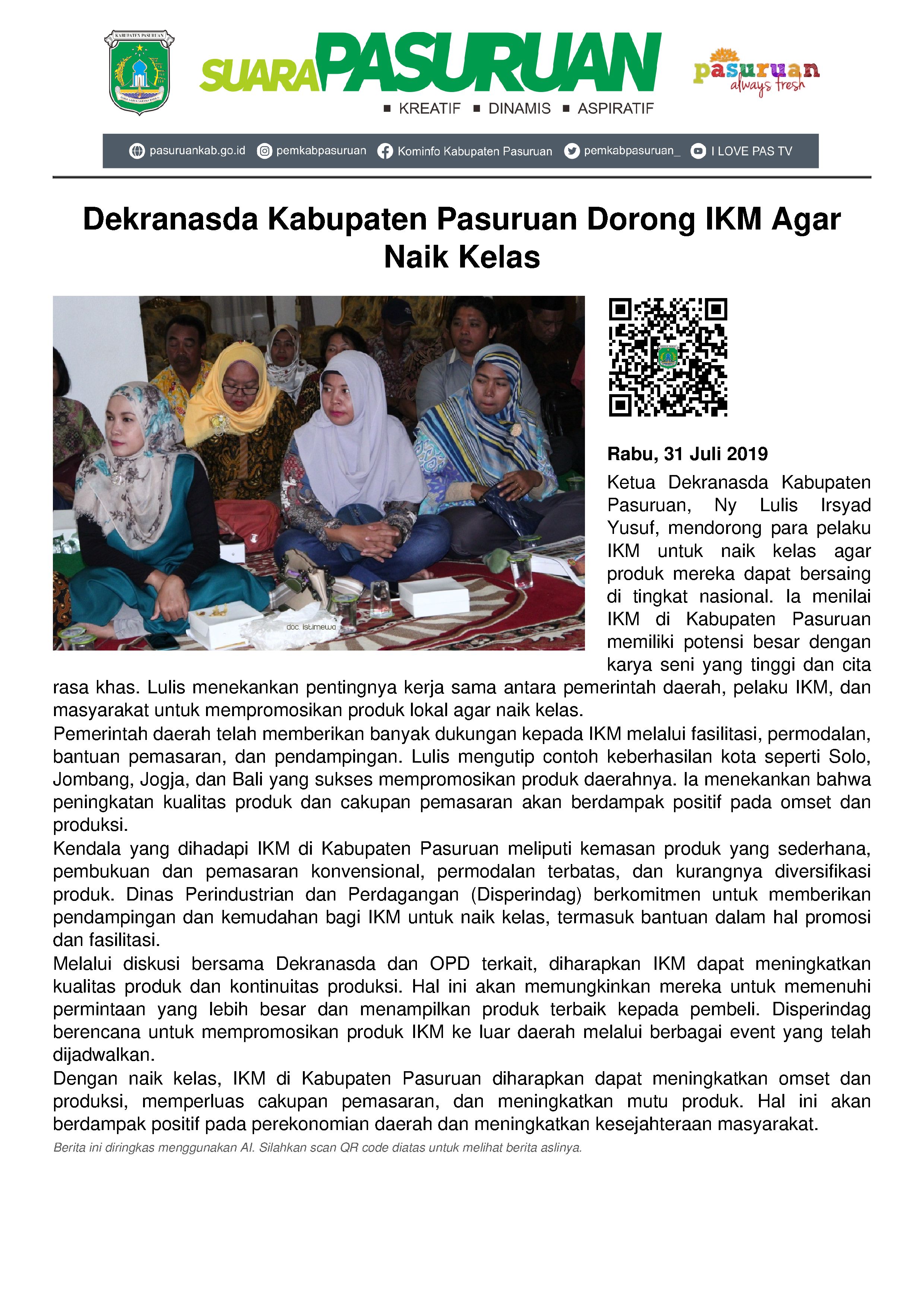 Ketua Dewan Kerajinan Nasional Daerah (Dekranasda) Kabupaten Pasuruan, Ny Lulis Irsyad Yusuf mendorong pelaku Industri Kecil Menengah (IKM) agar naik kelas, sehingga produk yang dihasilkan dapat bersaing bukan hanya di tingkatan local saja, melainkan sampai terkenal di seluruh penjuru negeri.