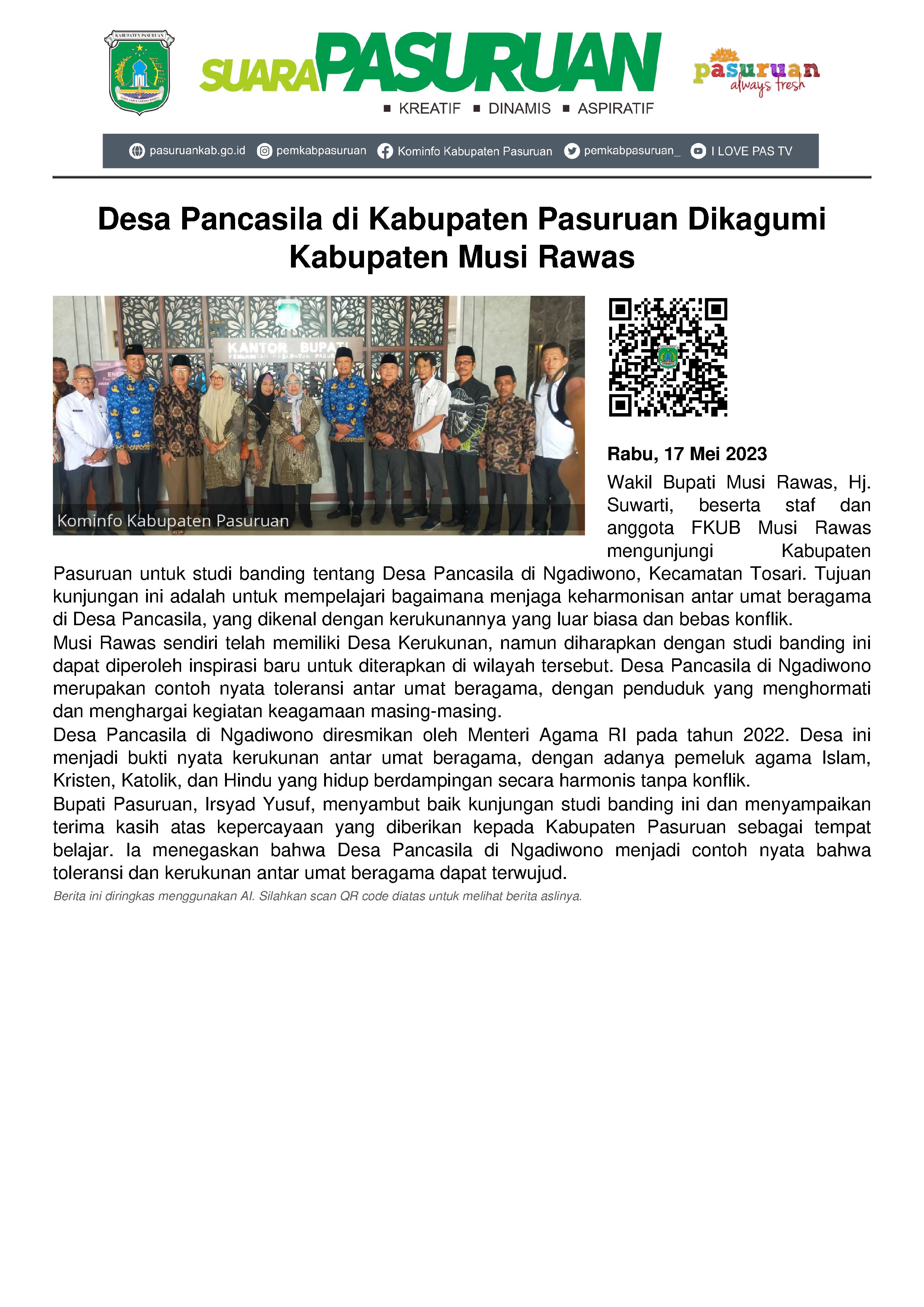 Di Musi Rawas ada pula Desa Kerukunan yang dibentuk di sana. Hanya saja, dengan studi banding ke Desa Pancasila di Ngadiwono, Suwarti berharap ada hal baru yang didapatkan untuk kemudian diaplikasikan di Musi Rawas.