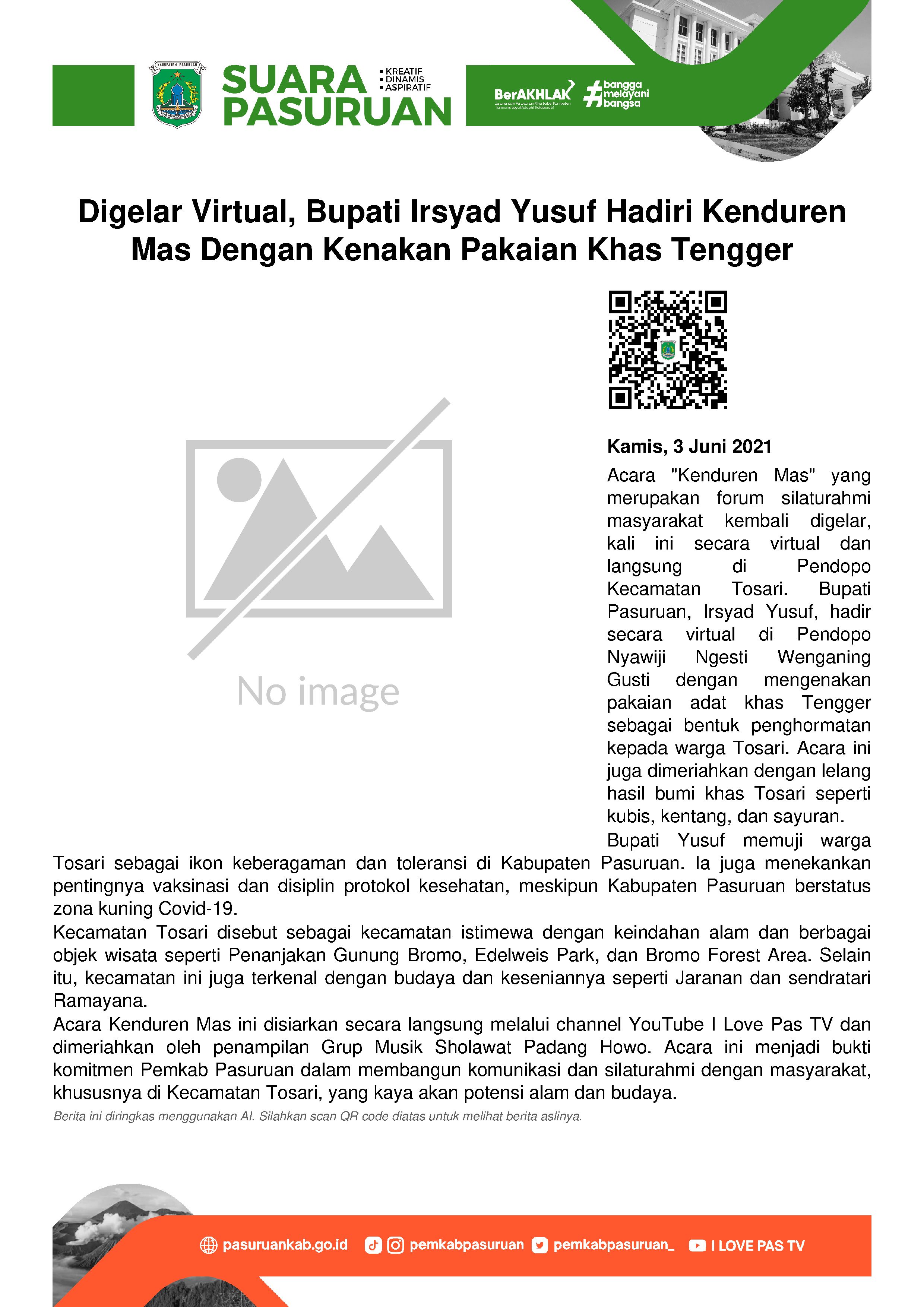 Dalam sambutannya, Bupati mengaku bangga bisa menggelar Live Virtual Kenduren Mas dengan warga Tosari. Untuk itu, sebagai ungkapan kebanggaan, ia dan semua yang hadir di Pendopo memakai pakaian adat khas Tengger. Selain itu, sajian makanan dan minuman (Mamin) yang disuguhkan di Pendopo juga dari Tosari, yakni semenan (semacam sayuran hijau yang dimakan sebagai lalapan) dan Kentang Granola Kembang yang menjadi produk alam unggulan Tosari.