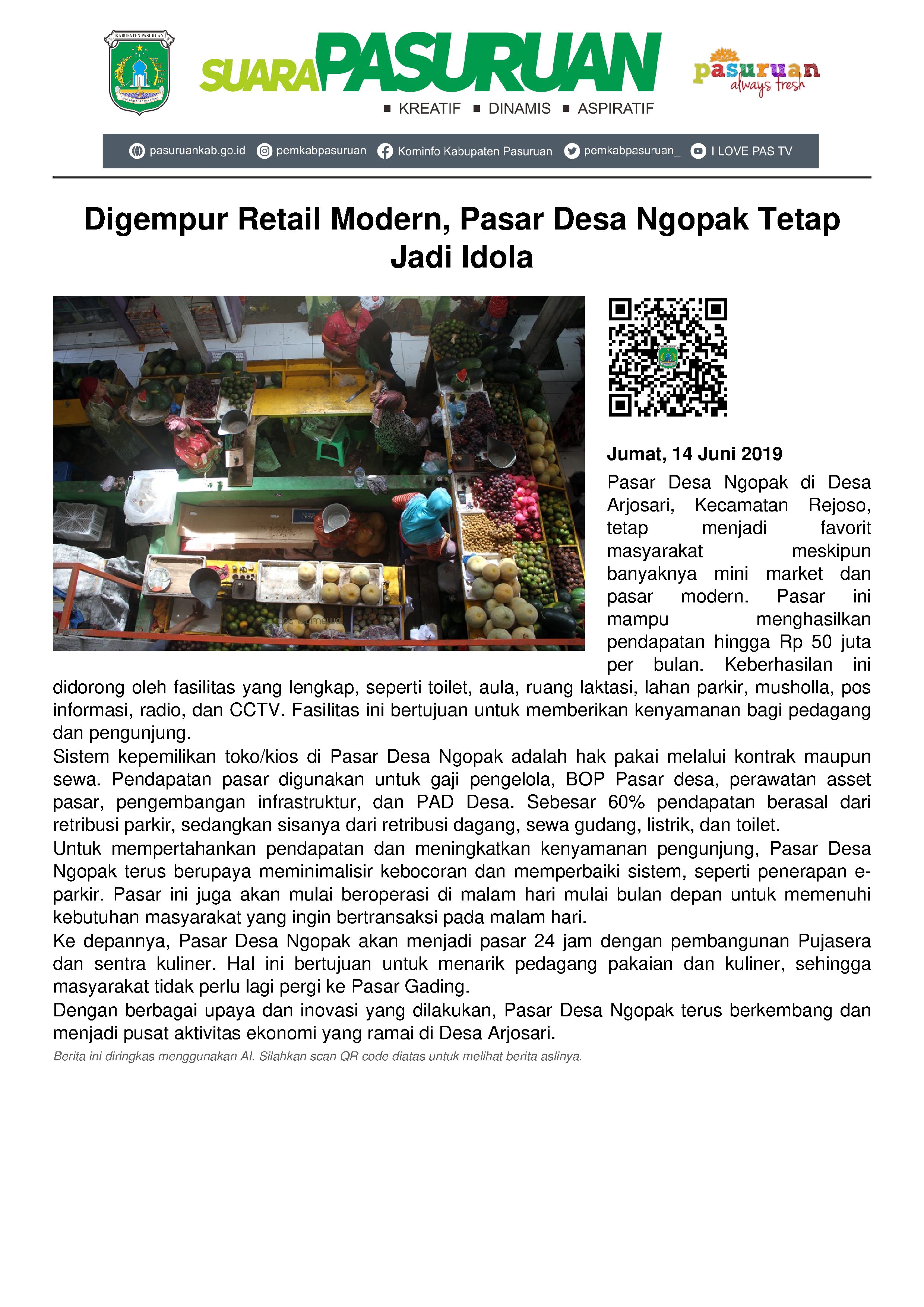 Di tengah gempuran banyaknya mini market hingga pasar modern, Pasar Desa Ngopak, Desa Arjosari, Kecamatan Rejoso, tetap menjadi idola masyarakat.