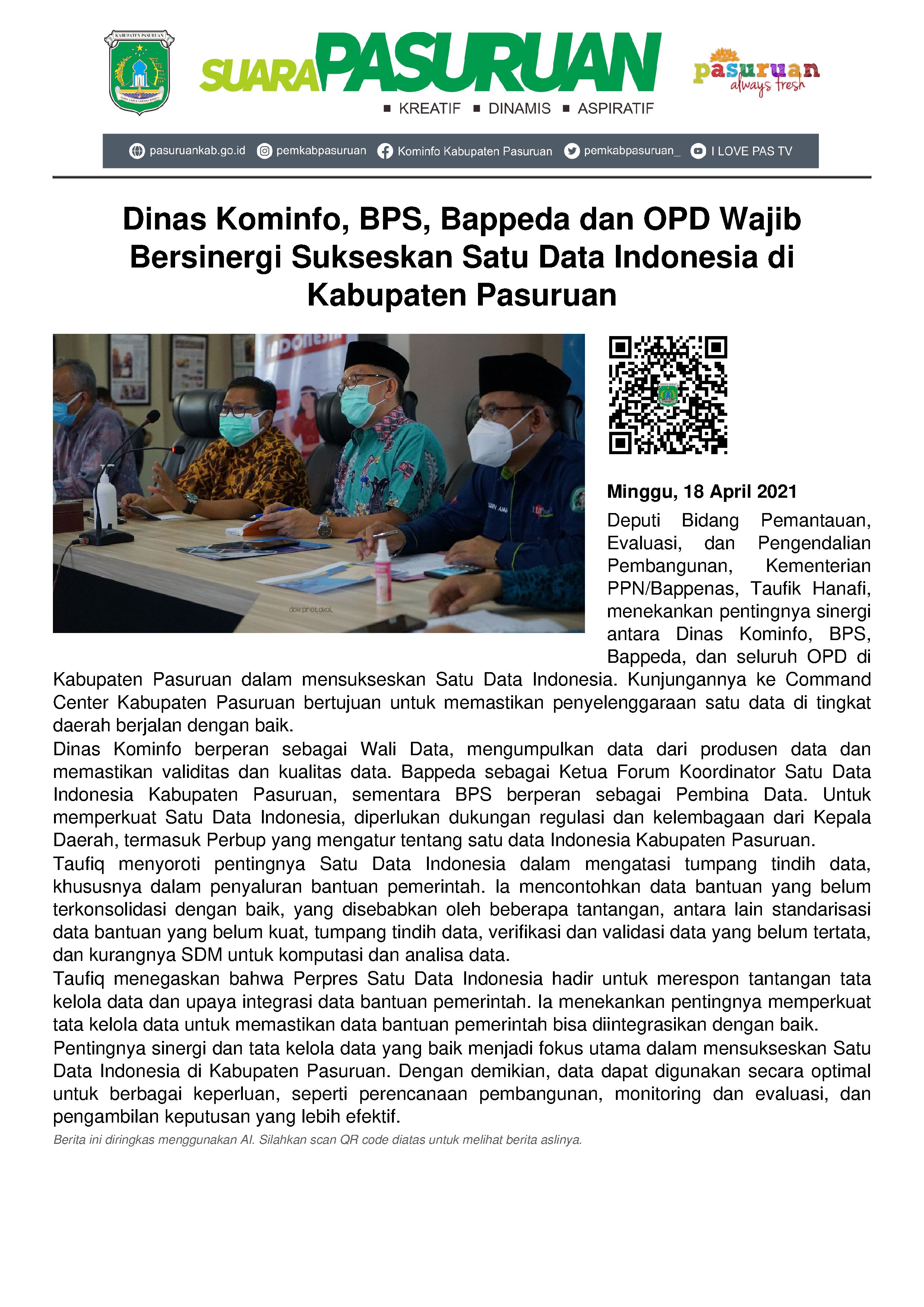 Deputi Bidang Pemantauan, Evaluasi, dan Pengendalian Pembangunan, Kementerian Perencanaan Pembangunan Nasional (PPN/Bappenas), Taufik Hanafi menegaskan bahwa dalam mensukseskan Satu Data Indonesia di Kabupaten Pasuruan, Dinas Kominfo, BPS (Badan Pusat Statistik), Bappeda (Badan Perencanaan Pembangunan Daerah) dan seluruh OPD harus bersinergi.