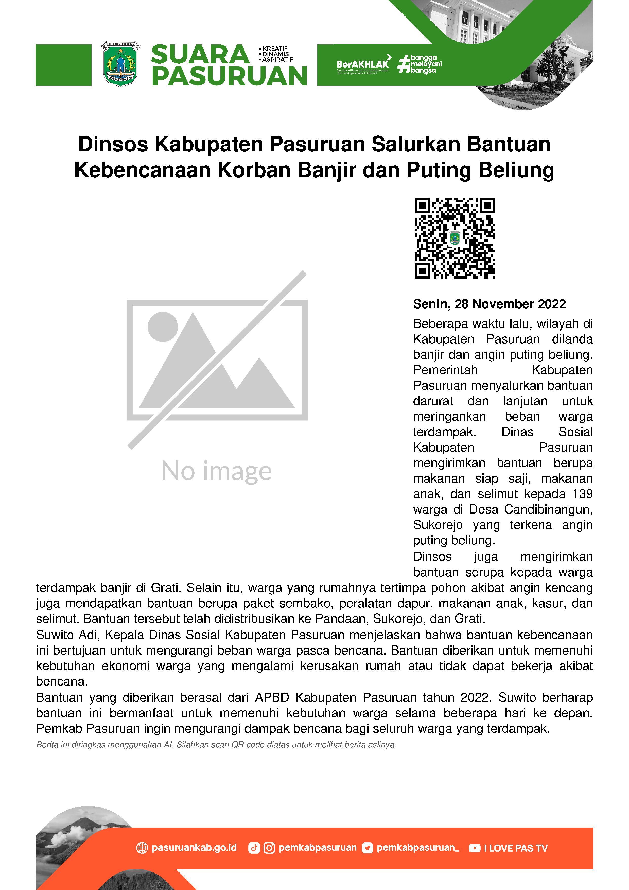 Kepala Dinas Sosial Kabupaten Pasuruan, Suwito Adi menjelaskan, pihaknya sudah mengirimkan bantuan sebanyak 1 truk untuk 139 warga terdampak angin puting beliung di Desa Candibinangun, Sukorejo. Bantuan tersebut berupa 100 paket makanan siap saji, 300 paket makanan anak dan 100 paket selimut.