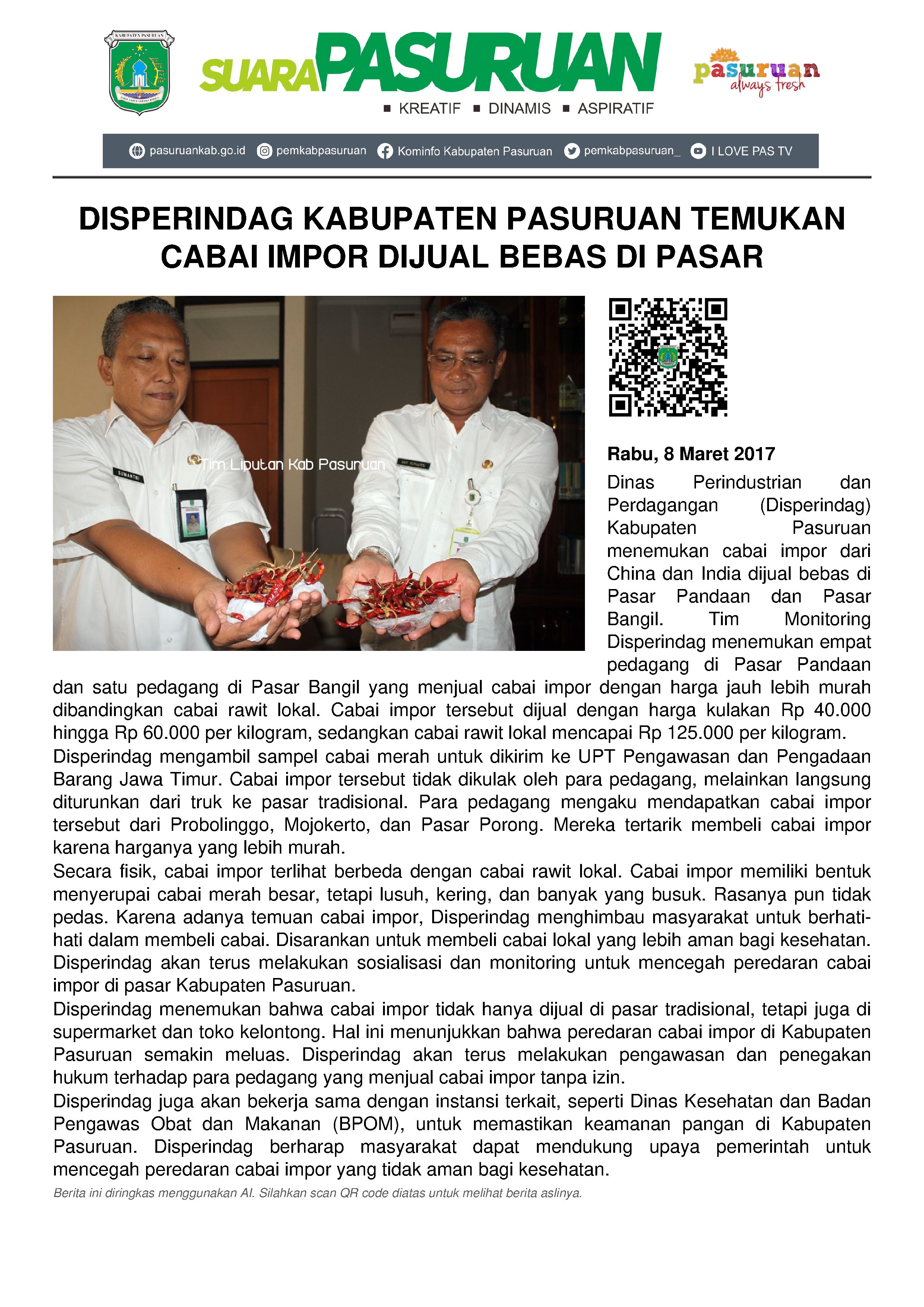 Dinas Perindustrian dan Perdagangan (Disperindag) Kabupaten Pasuruan menemukan cabai impor dari China dan India, dijual bebas di Pasar Pandaan dan Pasar Bangil.