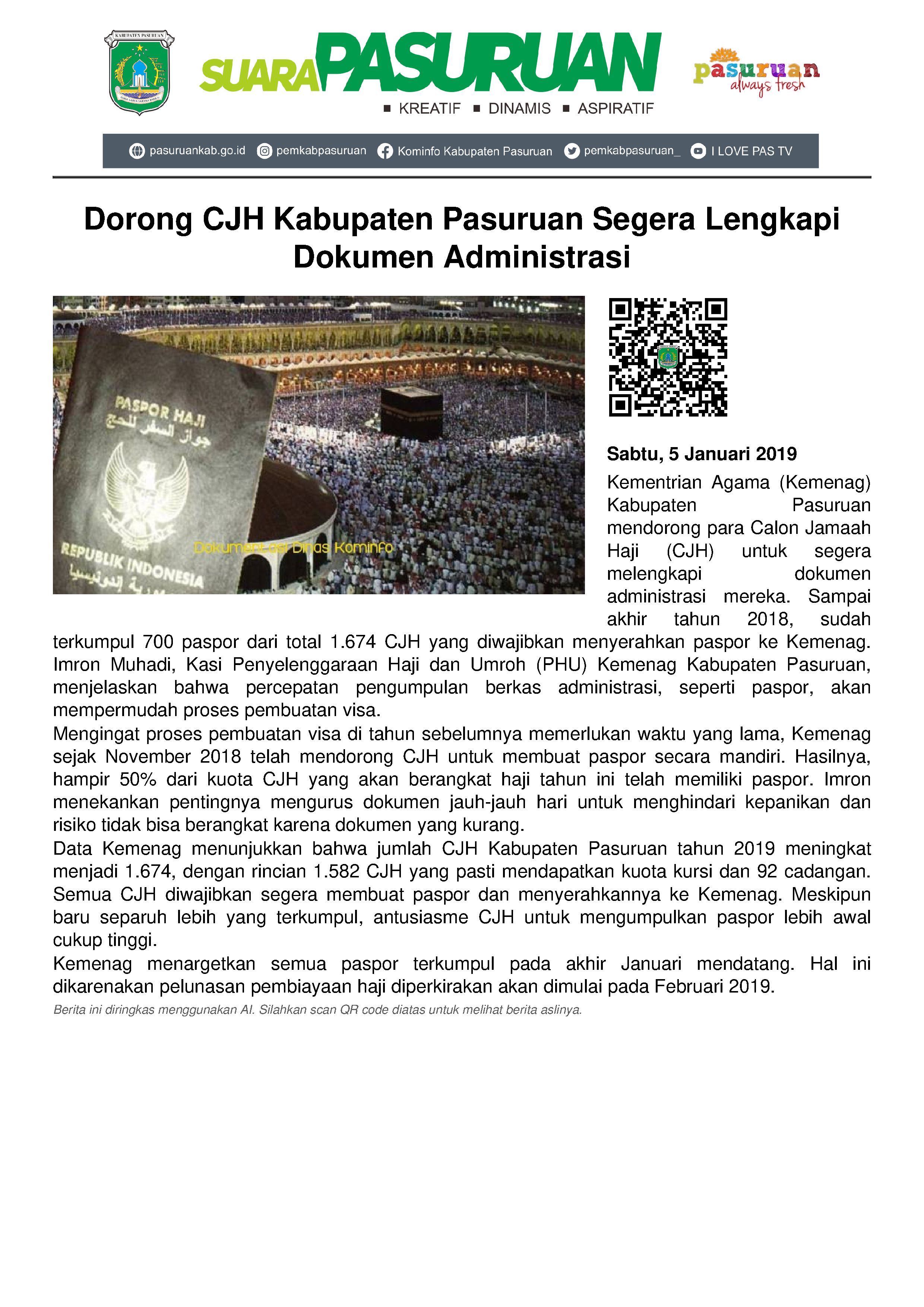 Kementrian Agama (Kemenag) Kabupaten Pasuruan mendorong Calon Jamaah Haji (CJH) untuk secepat mungkin melengkapi administrasi.