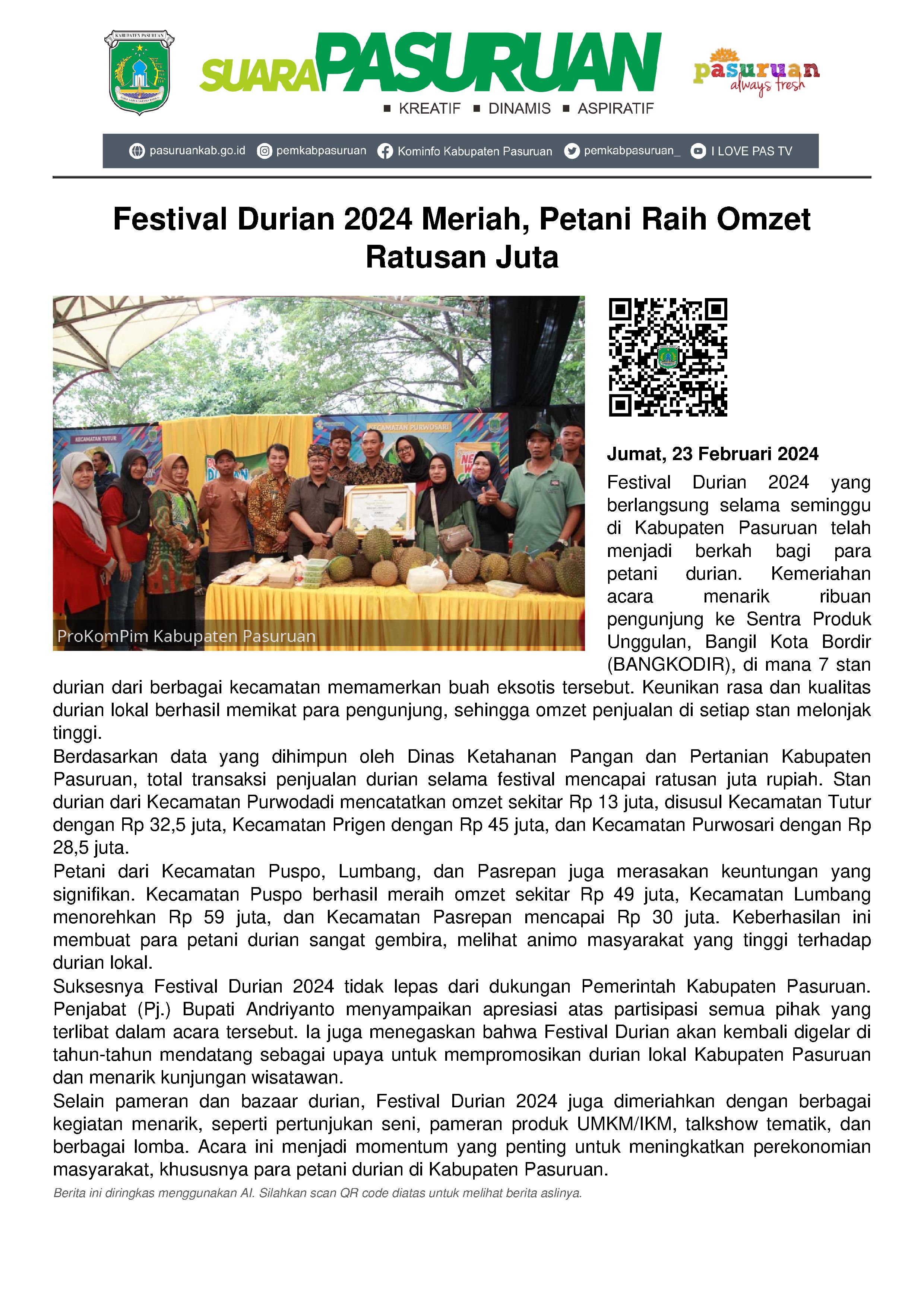 Rekap nominal transaksi penjualan bernilai fantastis yang dihasilkan dari setiap stan Durian di 7 Kecamatan daerah penghasil Durian tersebut pastinya memberikan kegembiraan luar biasa bagi para petaninya. Sesuai harapan dan prediksi awal, event Festival Durian 2024 tersebut dipadati khalayak, khususnya pecinta Durian. Seperti yang pernah diungkapkan Irul, petani Durian dari Kecamatan Puspo yang berjualan bersama kedua rekannya sesama petani Durian, Kusnalim dan Untung.