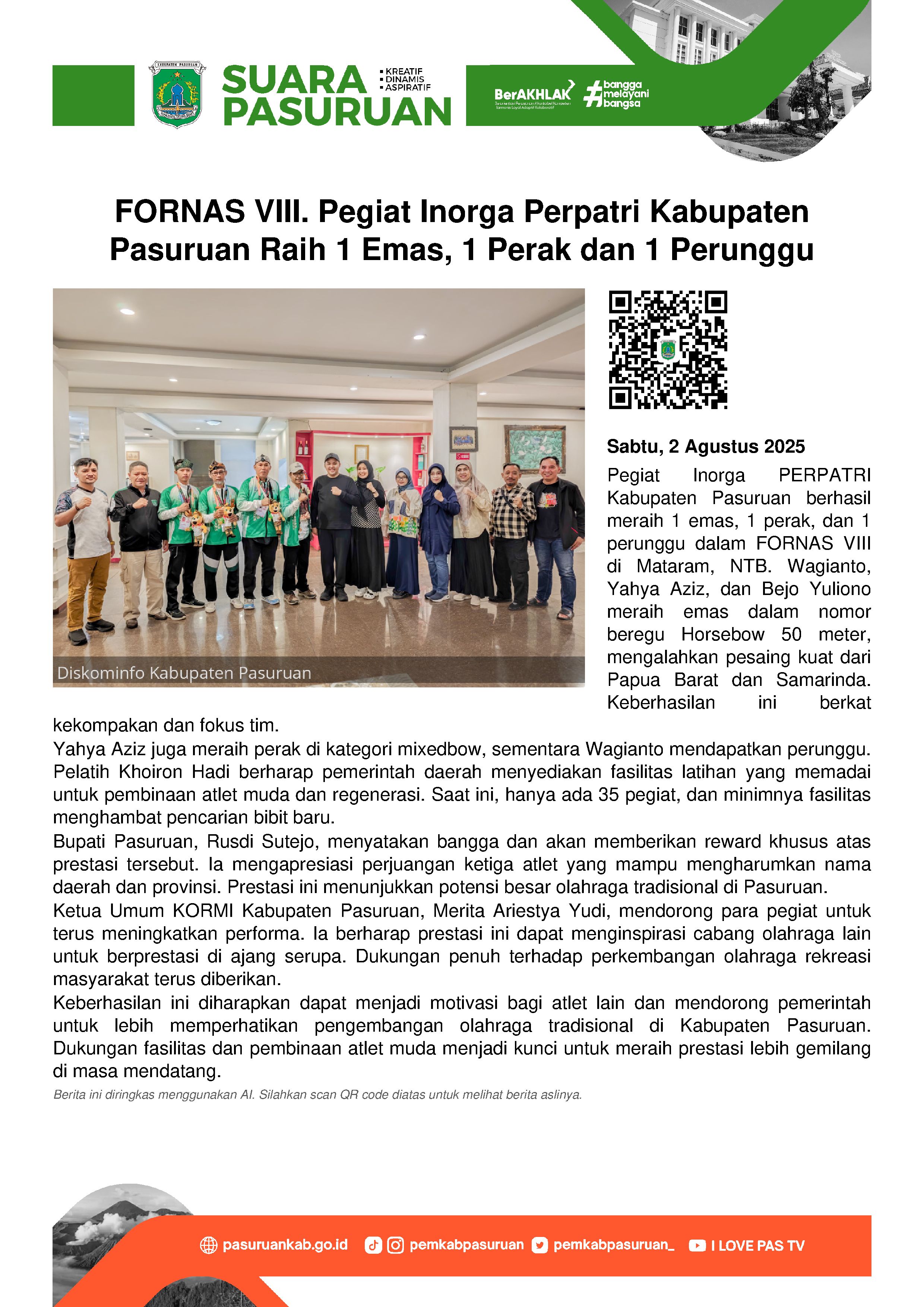 Pegiat Inorga PERPATRI (Persatuan Panahan Tradisional Indonesia) Kabupaten Pasuruan sukses mempersembahkan medali emas bagi kontingen Jawa Timur dalam ajang Festival Olahraga Masyarakat Nasional (FORNAS) VIII TAHUN 2025 di Kota Mataram, Nusa Tenggara Barat (NTB).