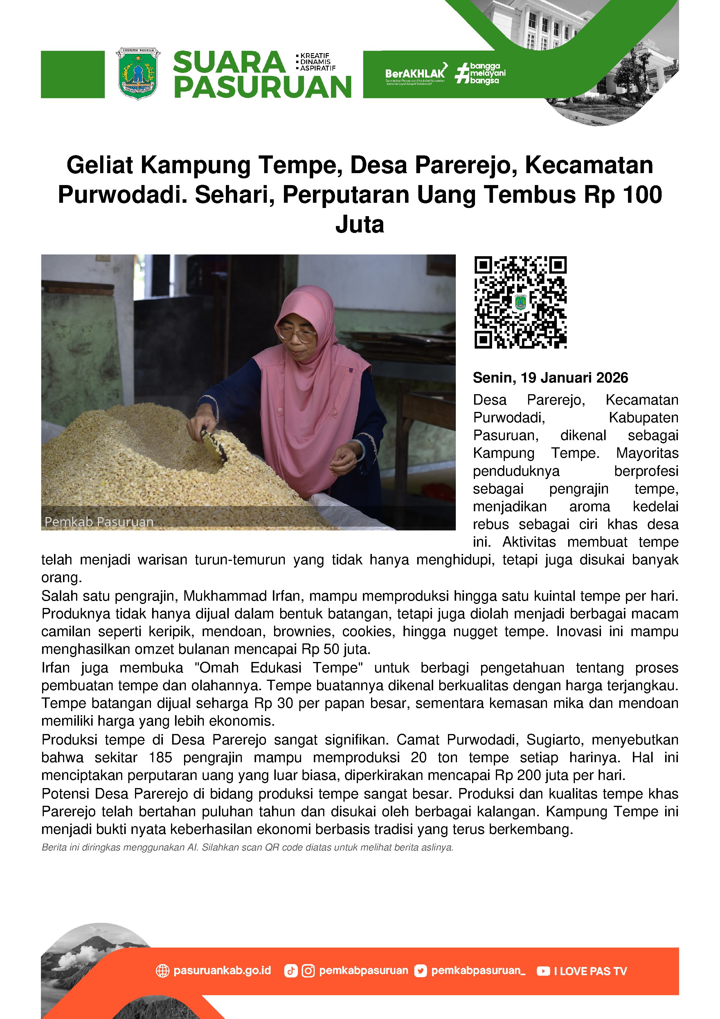 Sementara itu, Camat Purwodadi, Sugiarto menegaskan dalam satu hari, produksi tempe dari sekitar 185 pengrajin tempe di Desa Parerejo mencapai 20 ton. Maka tak salah bahwa perputaran uang dari kegiatan memproduksi tempe per harinya bisa mencapai Rp 200 juta.