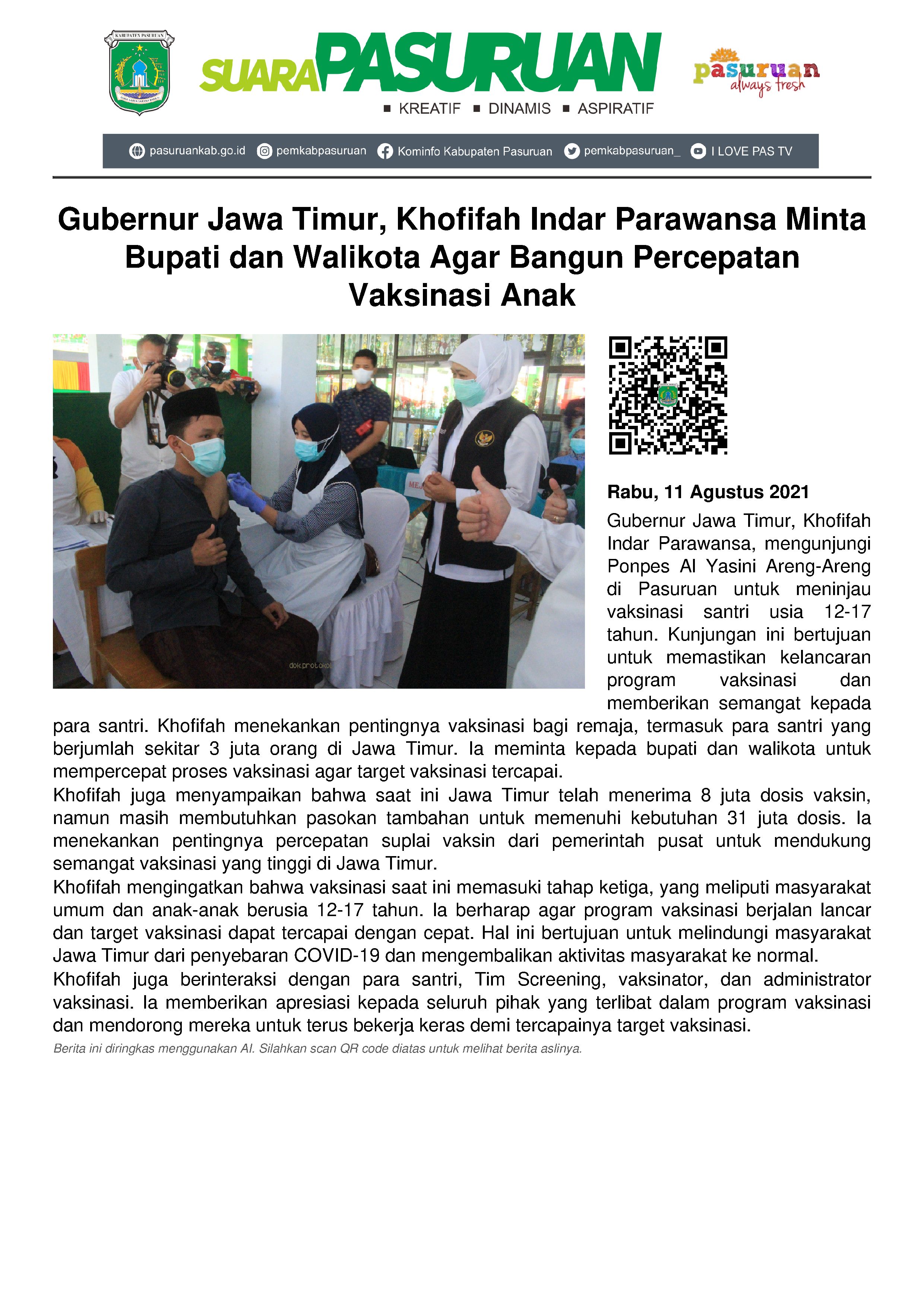 Kedatangan orang nomor satu di Jawa Timur ini tak lain dalam rangka meninjau pelaksanaan vaksinasi santri usia 12-17 tahun sekaligus memastikan agar seluruhnya berjalan baik dan lancar.