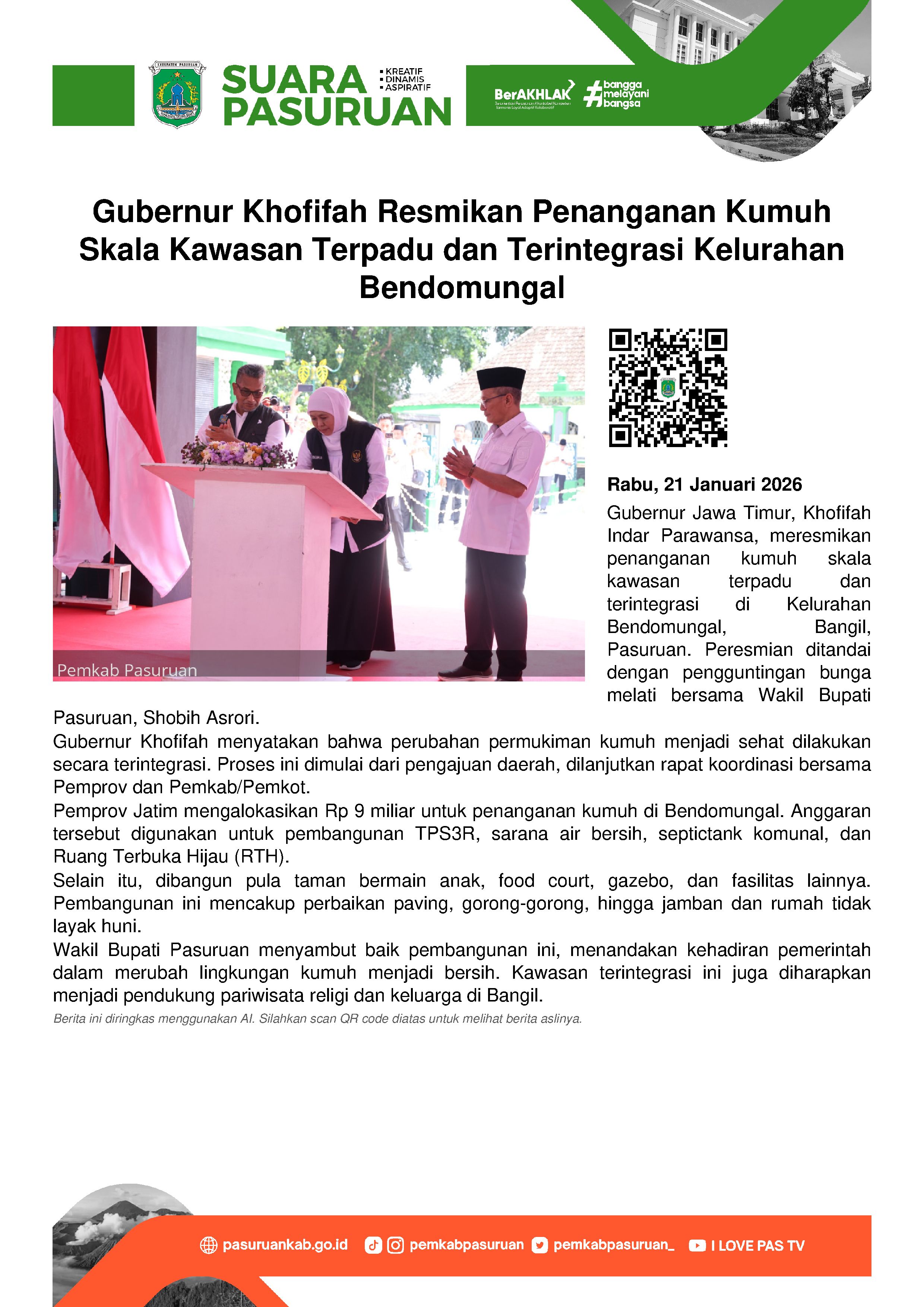 Gubernur Jatim, Khofifah Indar Parawansa, meresmikan Penanganan Kumuh Skala Kawasan Terpadu dan Terintegrasi Kelurahan Bendomungal, Kecamatan Bangil, Kabupaten Pasuruan, Rabu (21/1/2026).