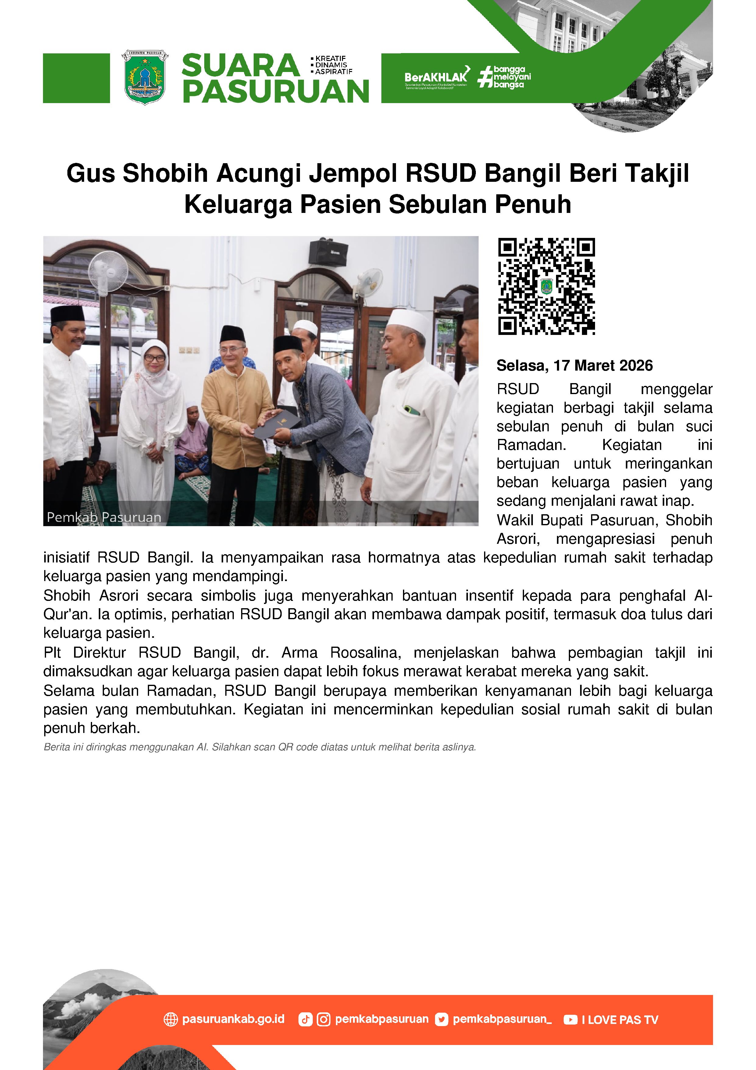 Bagi-bagi makanan untuk berbuka puasa tersebut dilaksanakan di Masjid Darus Syifa dan dihadiri oleh Wakil Bupati Pasuruan, Shobih Asrori; Plt Direktur RSUD Bangil, dr Arma Roosalina ; dan undangan lainnya.