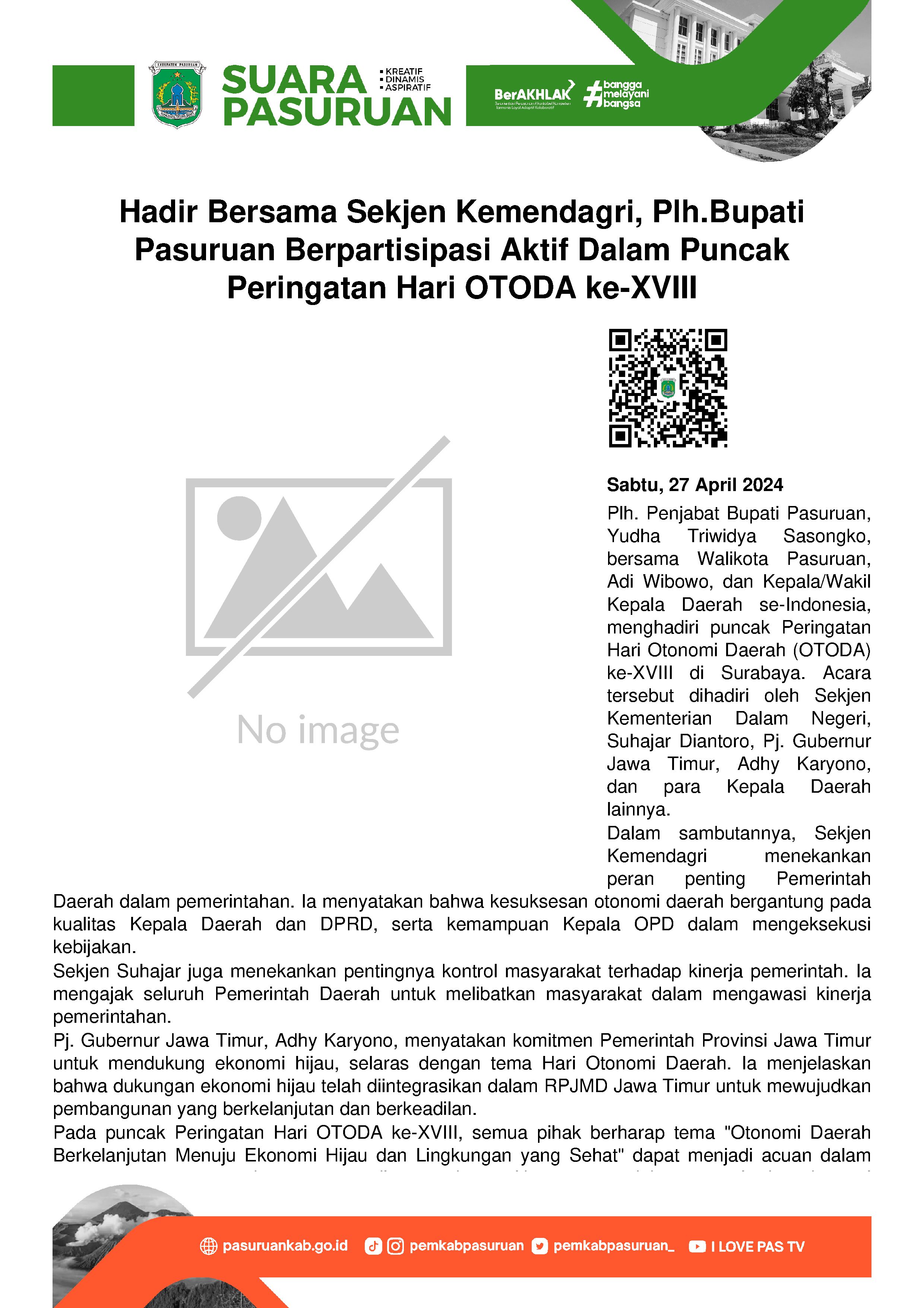 Pemerintah Kabupaten Pasuruan kembali berpartisipasi aktif dalam peringatan Hari Otonomi Daerah (OTODA) ke-XVIII yang diselenggarakan di Grand City Surabaya. Bersama Walikota Pasuruan, Adi Wibowo dan Kepala/Wakil Kepala Daerah se-Indonesia, Plh. Penjabat Bupati Pasuruan, Yudha Triwidya Sasongko hadir dalam acara seremonail yang dikemas dalam gala dinner tersebut. Turut hadir dalam kegiatan, Sekretaris Jenderal (Sekjen) Kementerian Dalam Negeri, Suhajar Diantoro beserta jajaran pejabat Kemendagri. Berikut, Pj. Gubernur Jawa Timur, Adhy Karyono dan Kepala Daerah se-Indonesia..