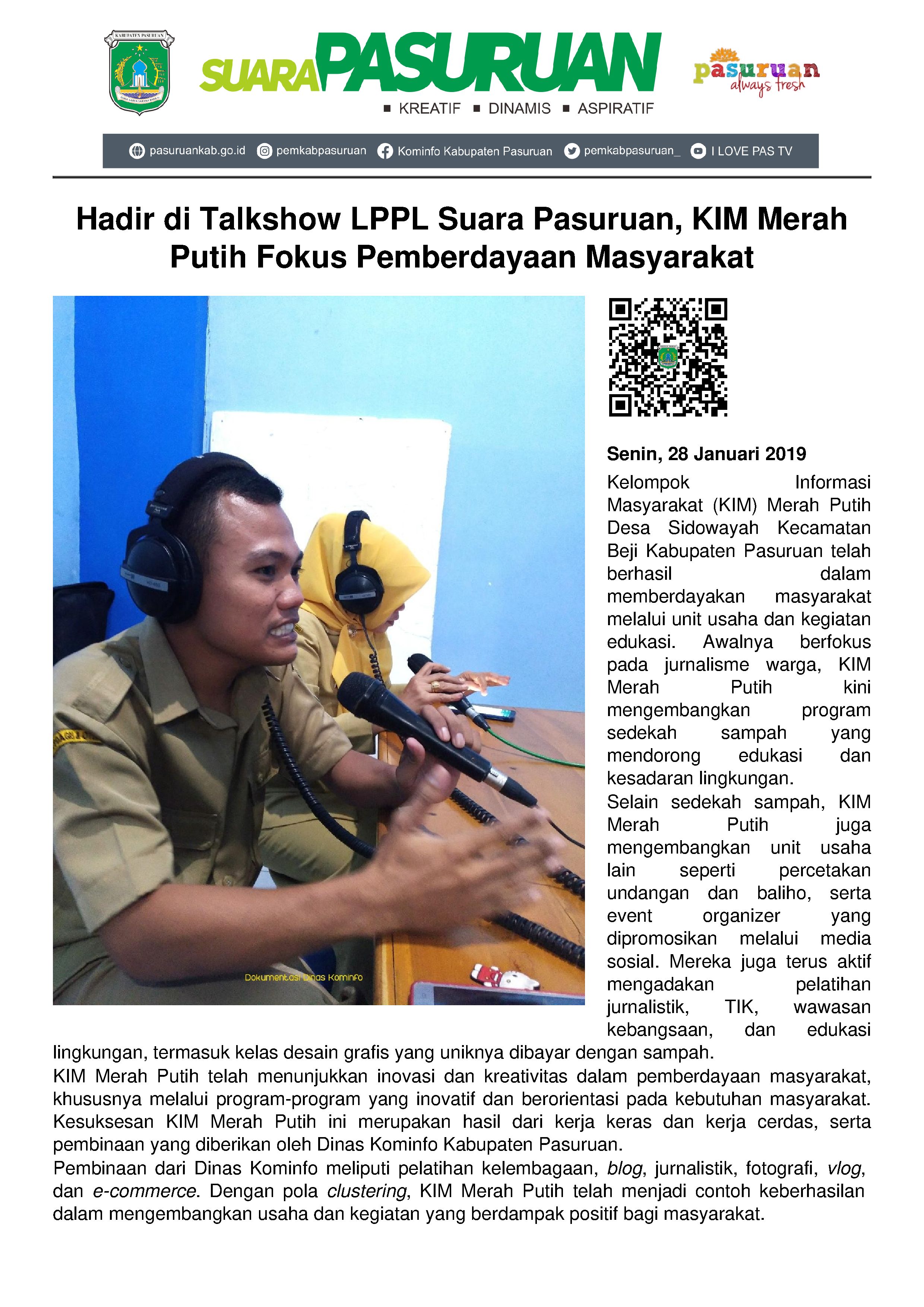 Tri Krisni Astuti, Kepala Bidang Komunikasi Publik Dinas Kominfo Kabupaten Pasuruan menyampaikan Pembinaan KIM selama ini membuahkan hasil yang sangat memuaskan dengan diberlakukannya pola clustering. Dengan pola clustering ini, KIM Merah Putih merupakan salah satu KIM yang berhasil mengembangkan usahanya dengan pembinaan-pembinaan yang telah dilaksanakan oleh Dinas Kominfo berupa pembinaan kelembagaan, pelatihan blog, pelatihan jurnalistik, pelatihan fotografi dan vlog serta pembinaan e-commerce untuk pengembangan unit usaha.