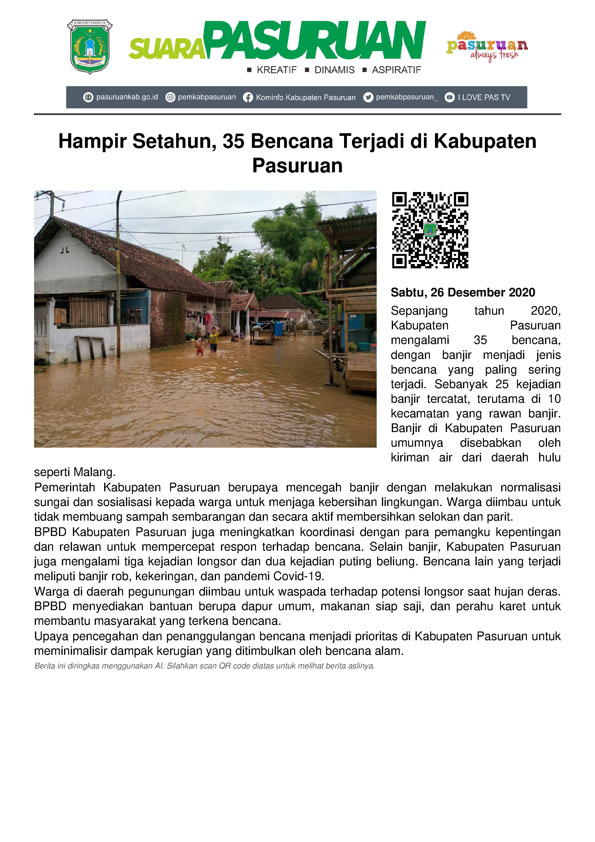 Sampai sejauh ini, Pemkab Pasuruan sudah melakukan sejumlah upaya untuk mengantisipasinya. Seperti normalisasi sungai, sosialisasi kepada warga untuk lebih peduli terhadap lingkungan.