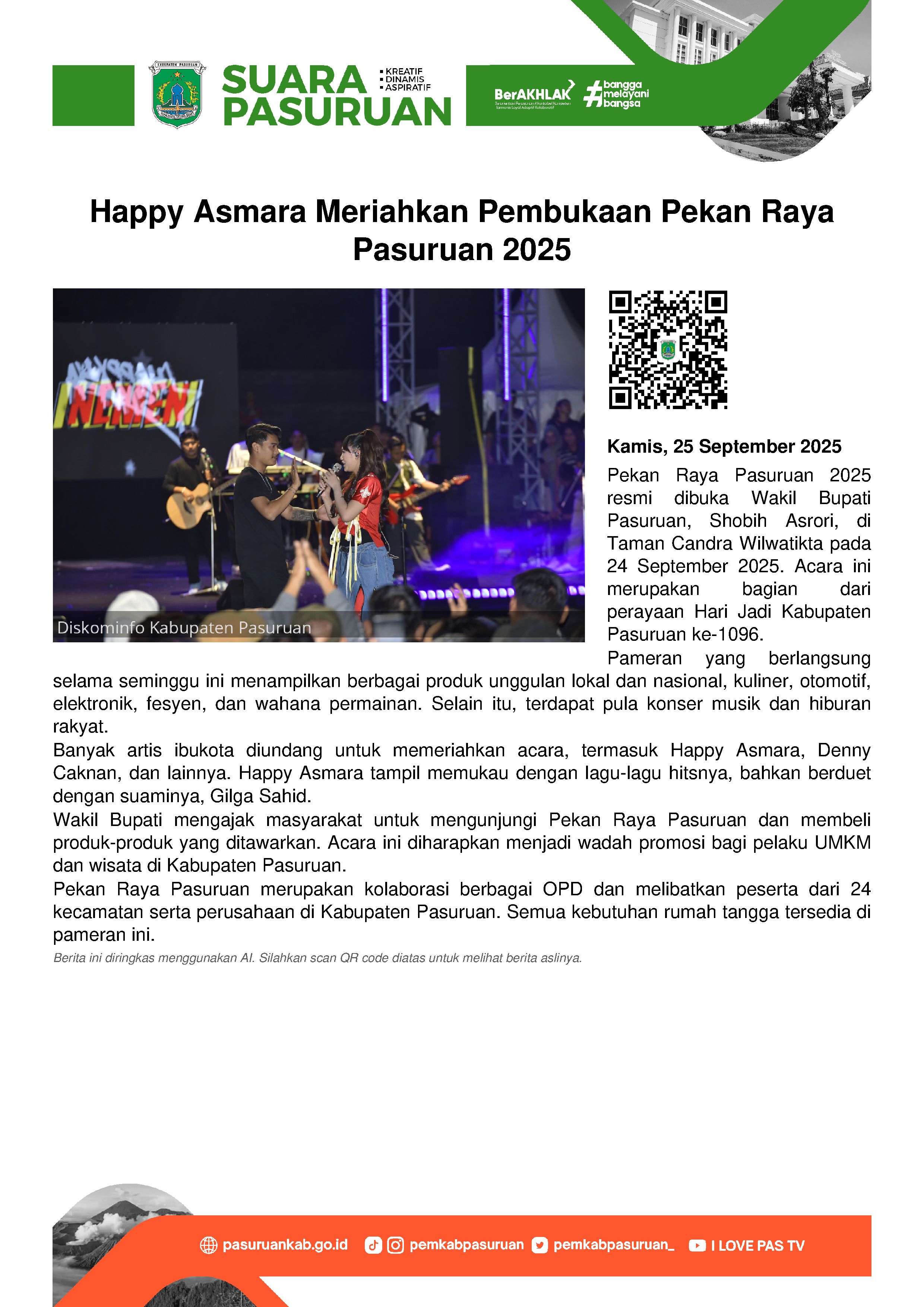 Pantauan di lokasi, Pembukaan Pekan Raya Pasuruan dimeriahkan oleh penampilan Happy Asmara. Perempuan asal Kediri itu sukses membius para pecintanya dengan lagu-lagu hitsnya seperti Tak Ikhlasno, Dalan Liyane dan lainnya. Tak lupa, ia juga membawa sang suami yang juga penyanyi terkenal, Gilga Sahid untuk berduet bersamanya. (emil)