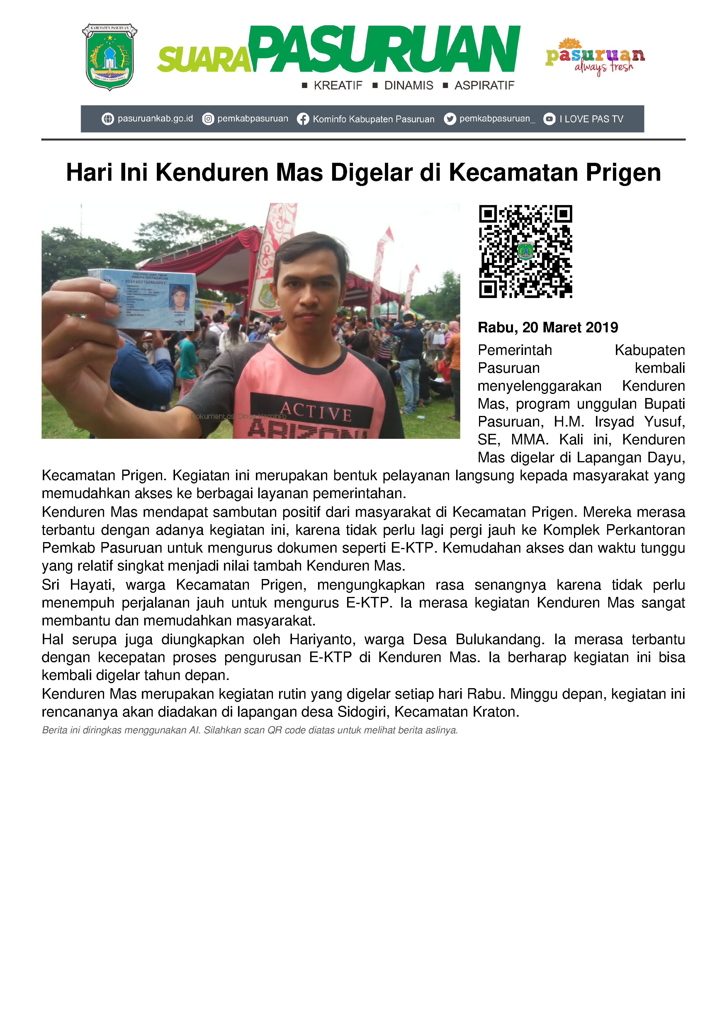 Sudah keempat kalinya, Pemerintah Kabupaten Pasuruan menggelar Kenduren Mas (Kendaraan Urun Rembug Masyarakat), pada saat ini Kenduren Mas digelar di Lapangan Dayu, Kecamatan Prigen, Kabupaten Pasuruan, hari Rabu (20/3).