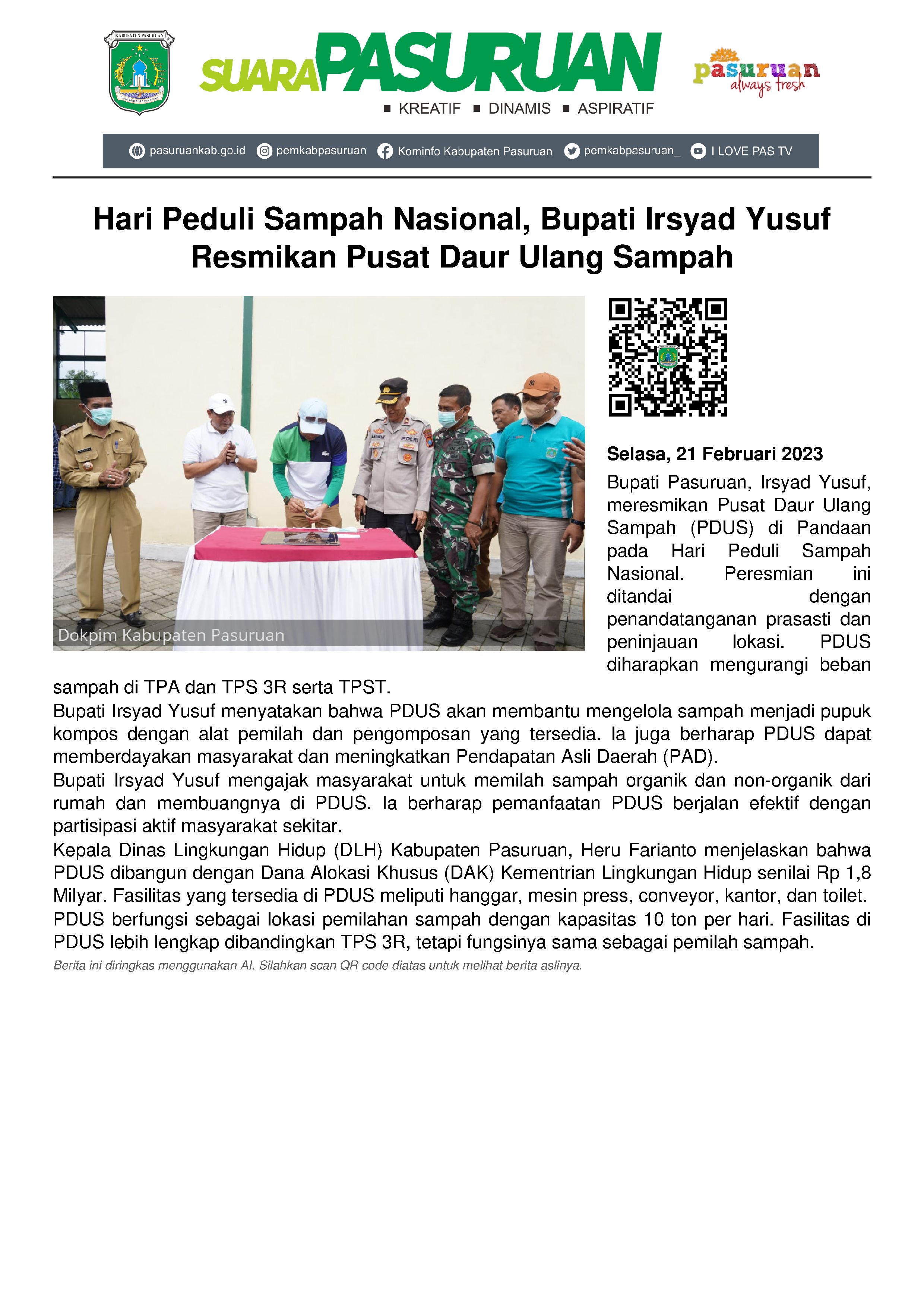 Memperingati Hari Peduli Sampah Nasional tahun ini, Bupati Pasuruan, Irsyad Yusuf meresmikan operasional Pusat Daur Ulang Sampah (PDUS).