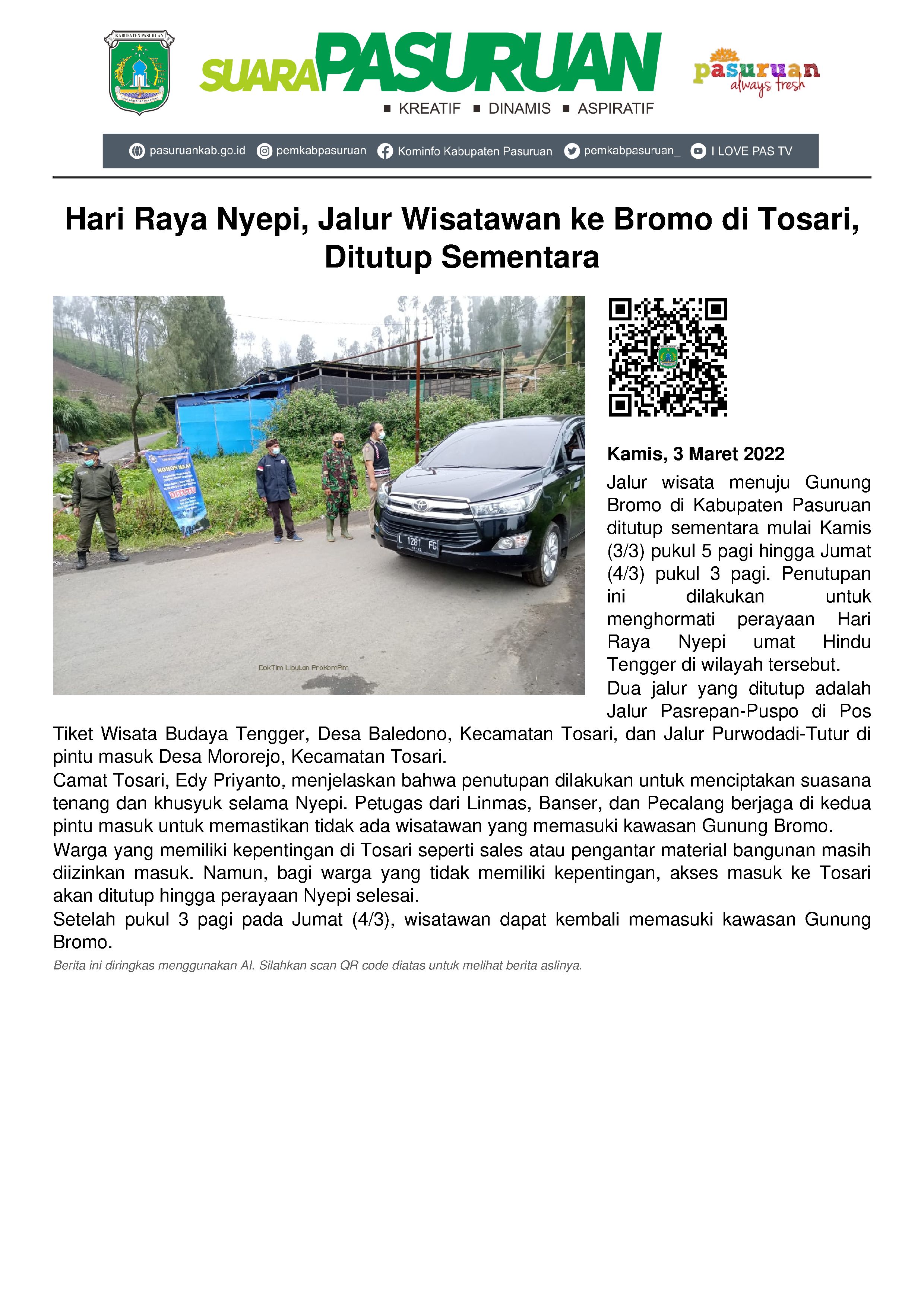 "Nyepi ya pasti sepi. Maka dari itu, untuk menghormati para umat hindu di Tosari ini, dua pintu masuk kami tutup, yakni di Baledono dan Mororejo," kata Edy saat dihubungi via telepon, Kamis (03/03/2022) sore.