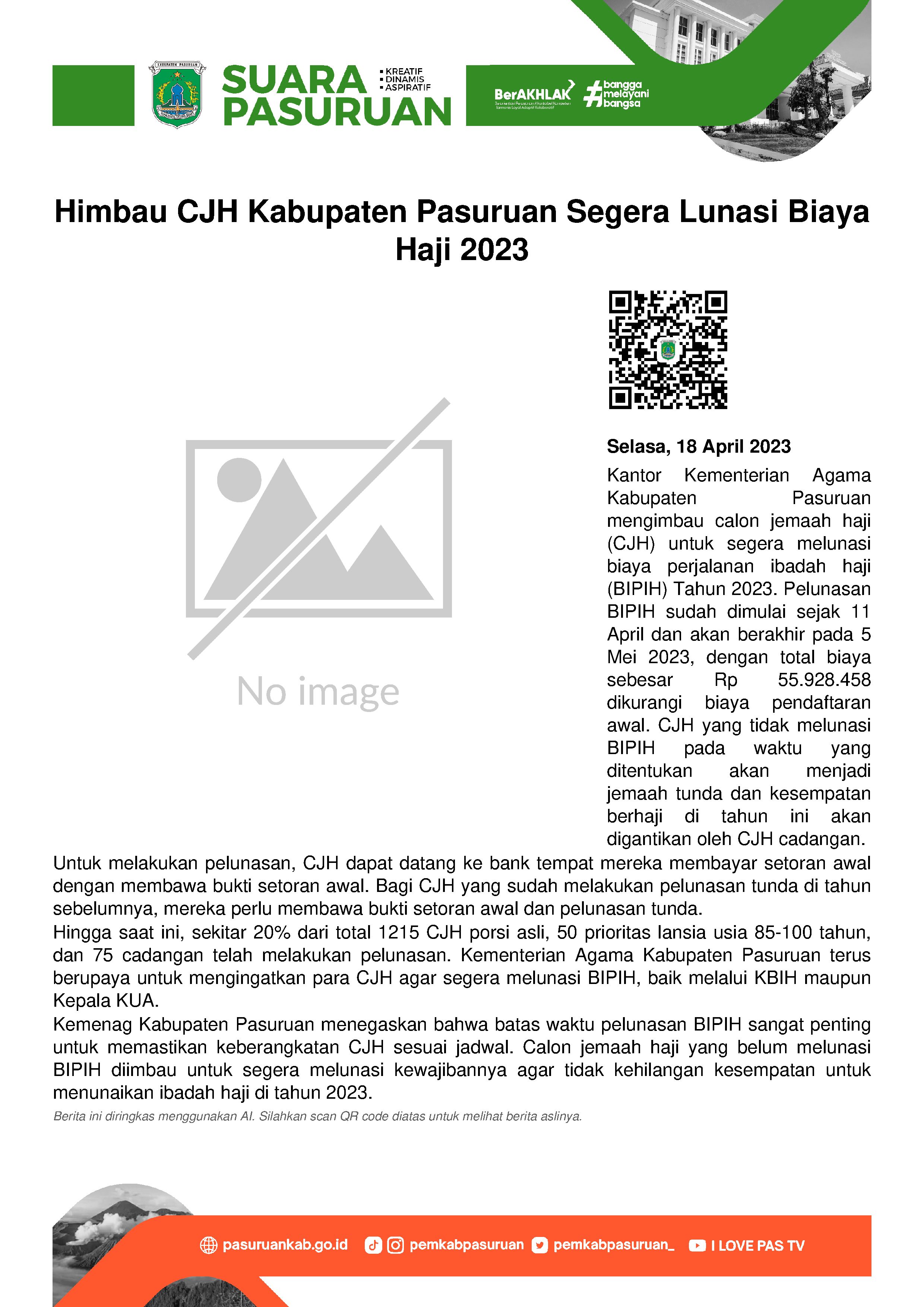 Kepala Kantor Kementrian Agama (Kemenag) Kabupaten Pasuruan, Syaikhul Hadi mengatakan, pembayaran BIPIH sudah dimulai sejak 11 april dan akan berakhir pada 5 mei 2023. Besarannya adalah Rp 55.928.458 dikurangi biaya pendaftaran Rp 25 juta ketika mendaftar haji.