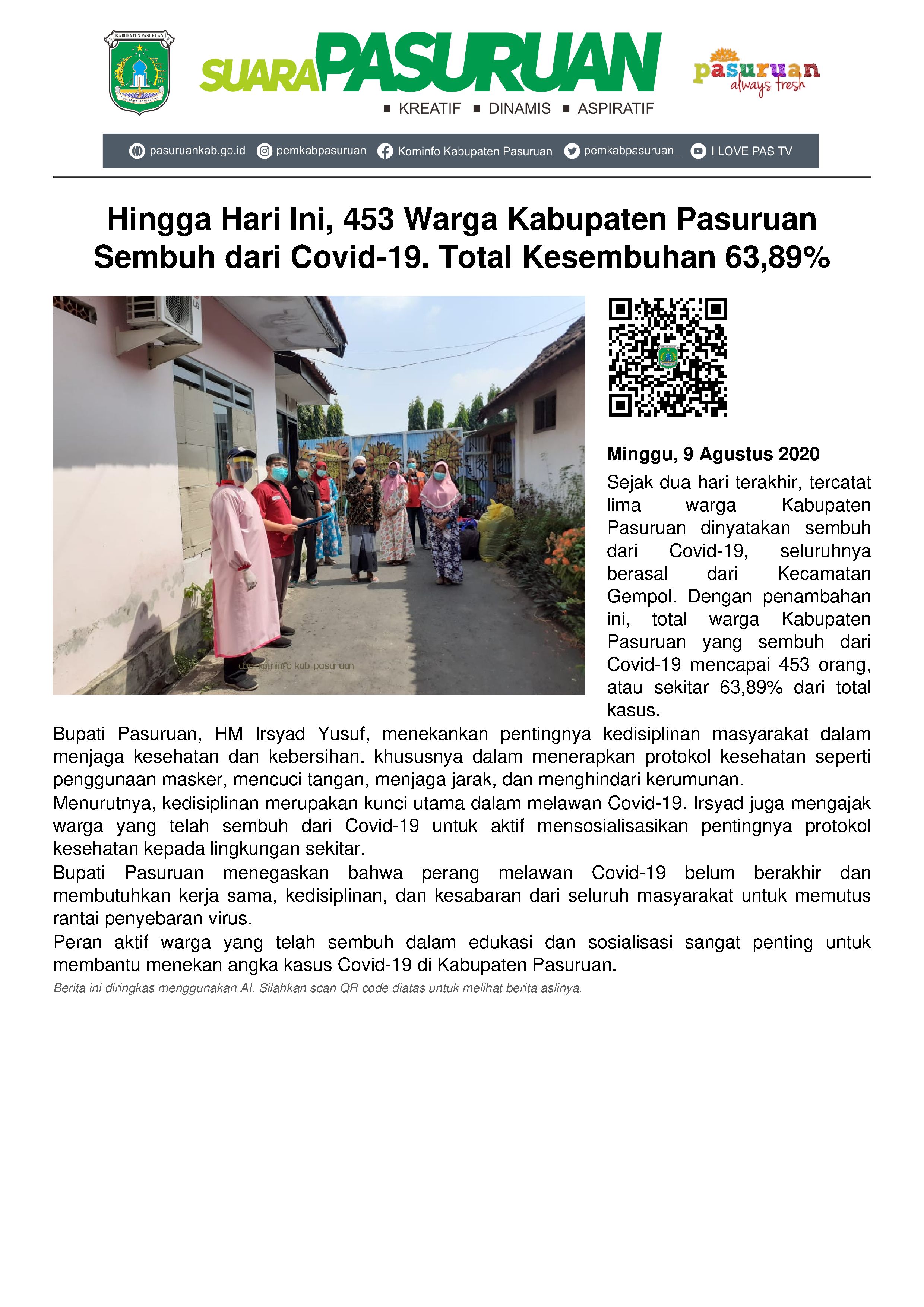 Dengan semakin banyaknya warga yang sembuh dari Covid-19,Bupati Pasuruan, HM Irsyad Yusuf menghimbau kepada masyarakat agar terus bisa menjaga kedisplinan dalam urusan kesehatan dan kebersihan. Hal ini penting dilakukan, lantaran kunci utama untuk melawan Covid-19 adalah komitmen tinggi untuk disiplin dalam menerapkan PHBS (perilaku hidup bersih dan sehat), serta senantiasa displin dalam melaksanakan anjuran pemerintah.