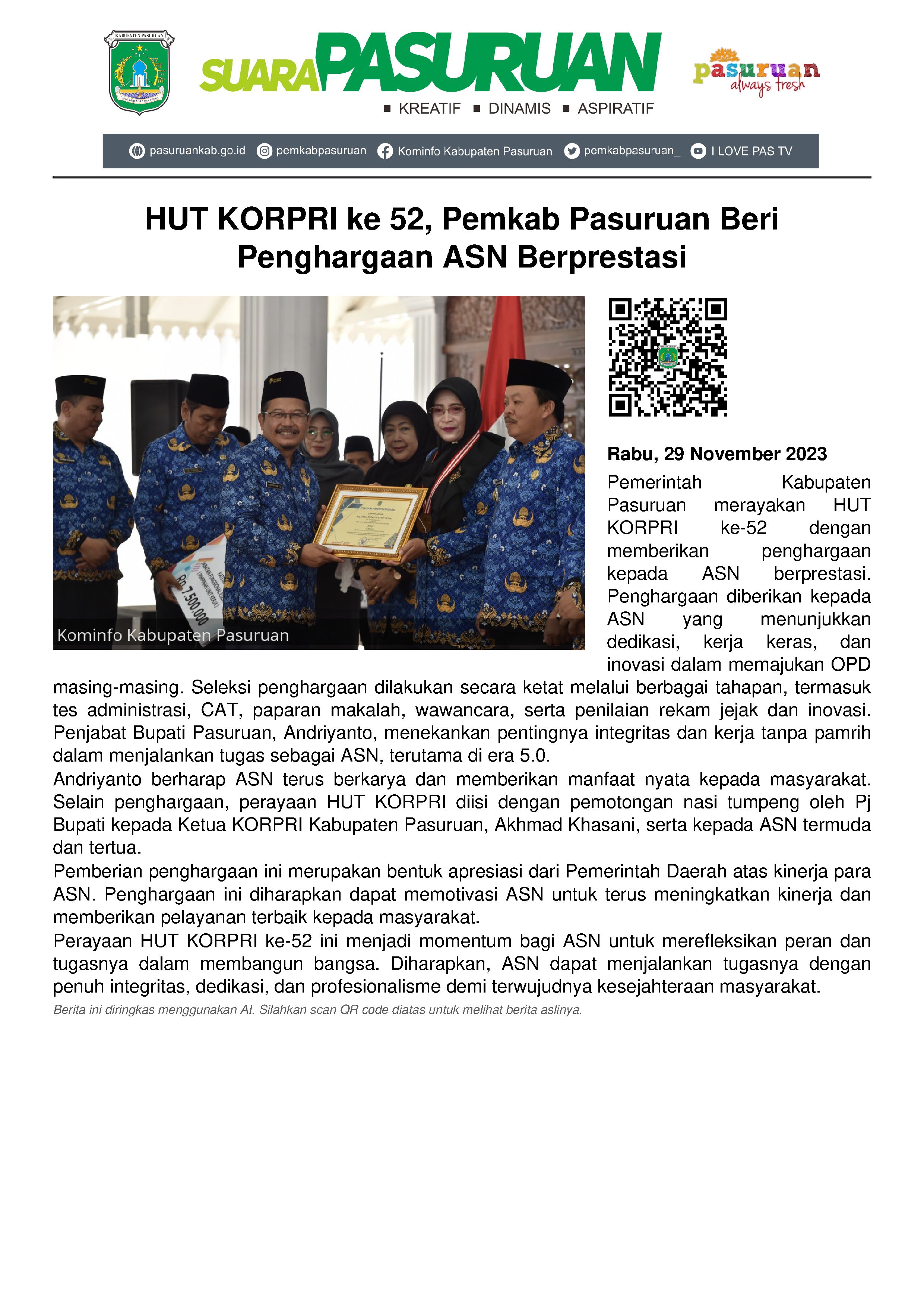 Pemerintah Kabupaten Pasuruan punya cara untuk menjadikan HUT KORPRI (Korps Pegawai Republik Indonesia) tahun ini semakin bermakna.