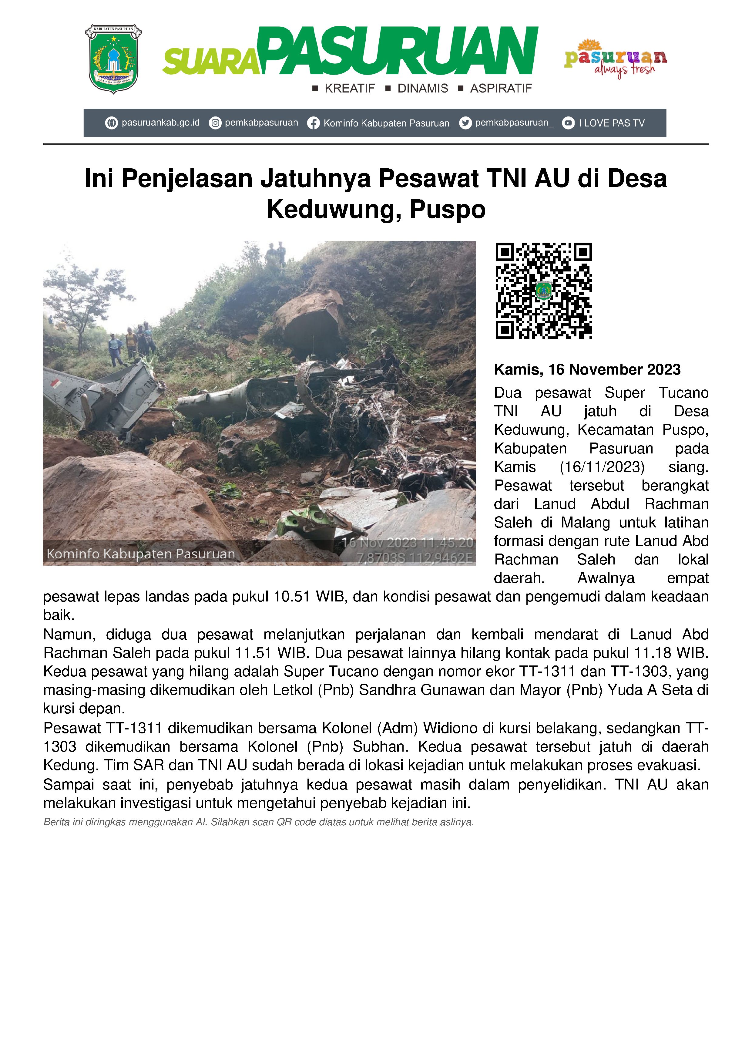 Kadispen AU Marsma Agung Sasongkojati menjelaskan kronologi jatuhnya dua pesawat di Desa Keduwung, Kecamatan Puspo, Kabupaten Pasuruan, Kamis (16/11/2023) siang.