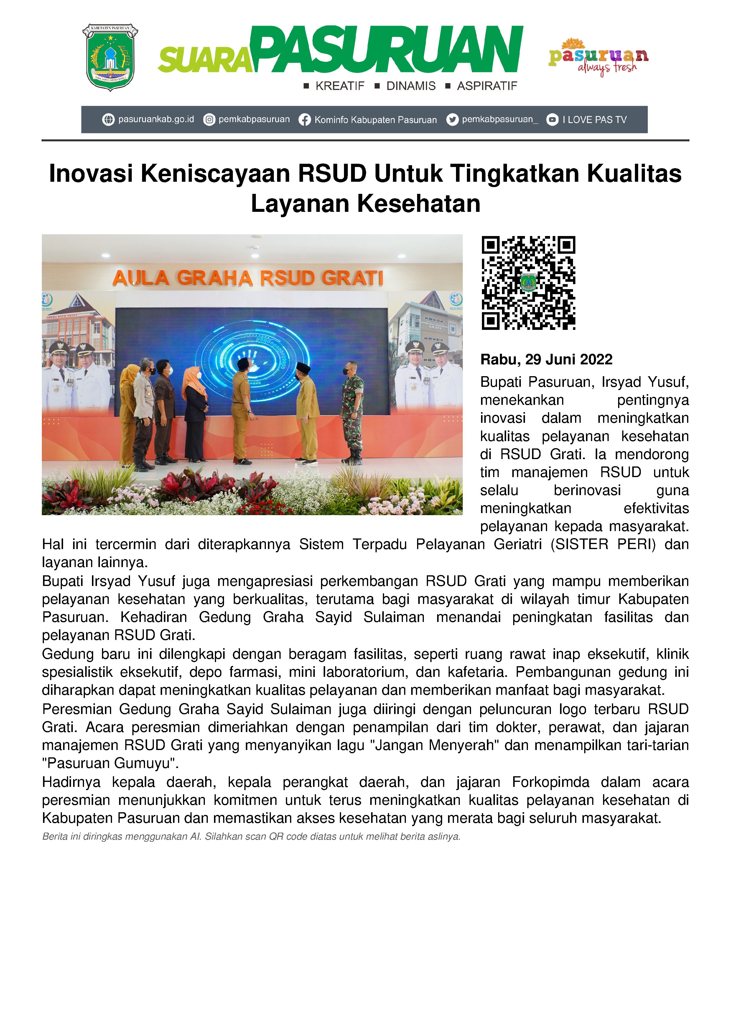 Rumah Sakit Umum Daerah (RSUD) dituntut rajin melahirkan beragam inovasi. Peningkatan kualitas pelayanan kesehatan sudah pasti tujuan utamanya. Demikian pesan yang disampaikan Bupati Irsyad Yusuf saat hadir dalam peresmian Gedung Graha RSUD Grati.