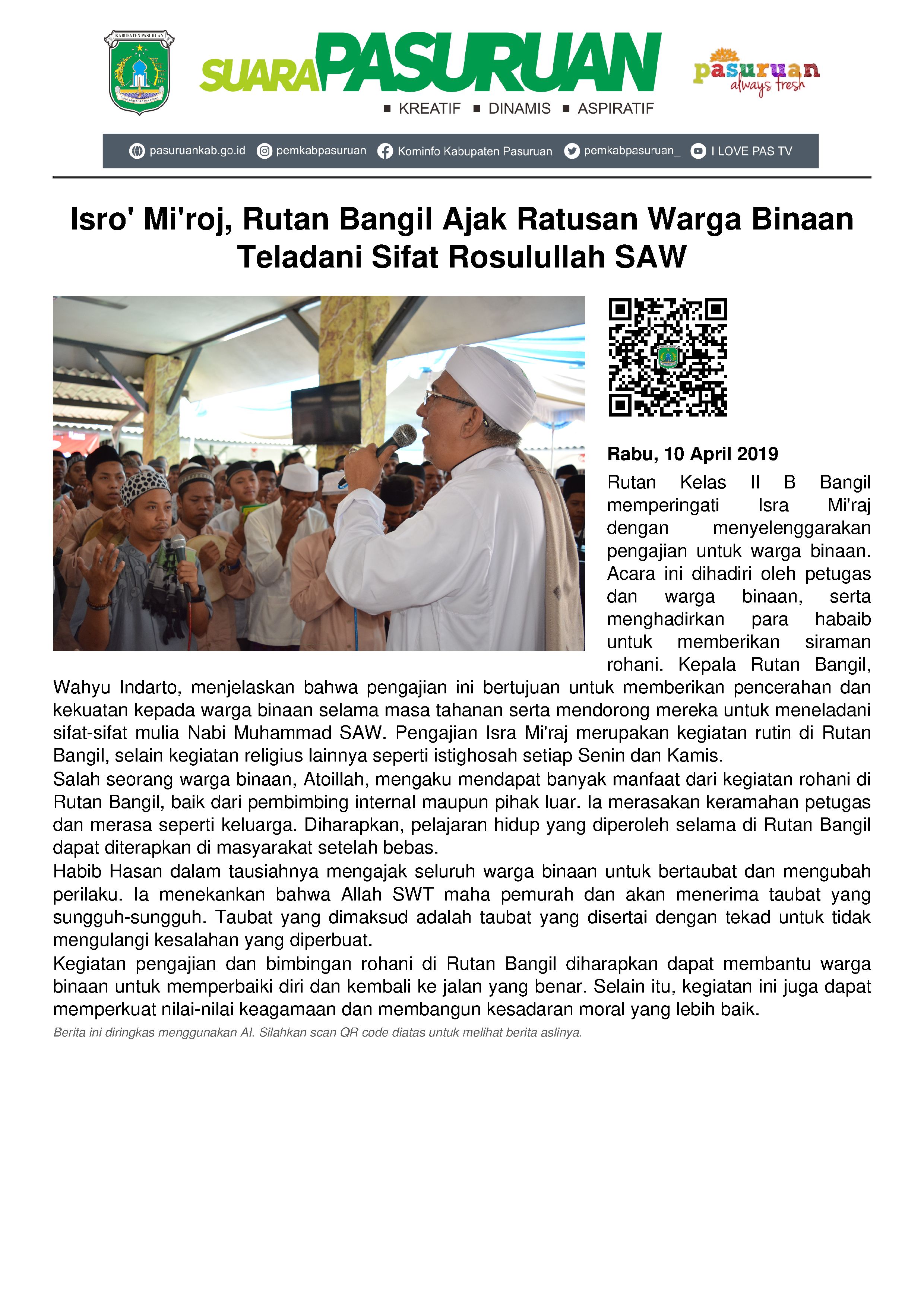 Di sela-sela acara, Wahyu juga menegaskan bahwa Pengajian dalam rangka memperingati Isro’ Mi’roj Nabi Muhammad SAW dilaksanakan rutin setiap tahunnya. Hal tersebut penting, lantaran kegiatan religius di Rutan Bangil juga menjadi kegiatan yang bersifat rutin, yakni istighosah setiap senin dan kamis pagi.