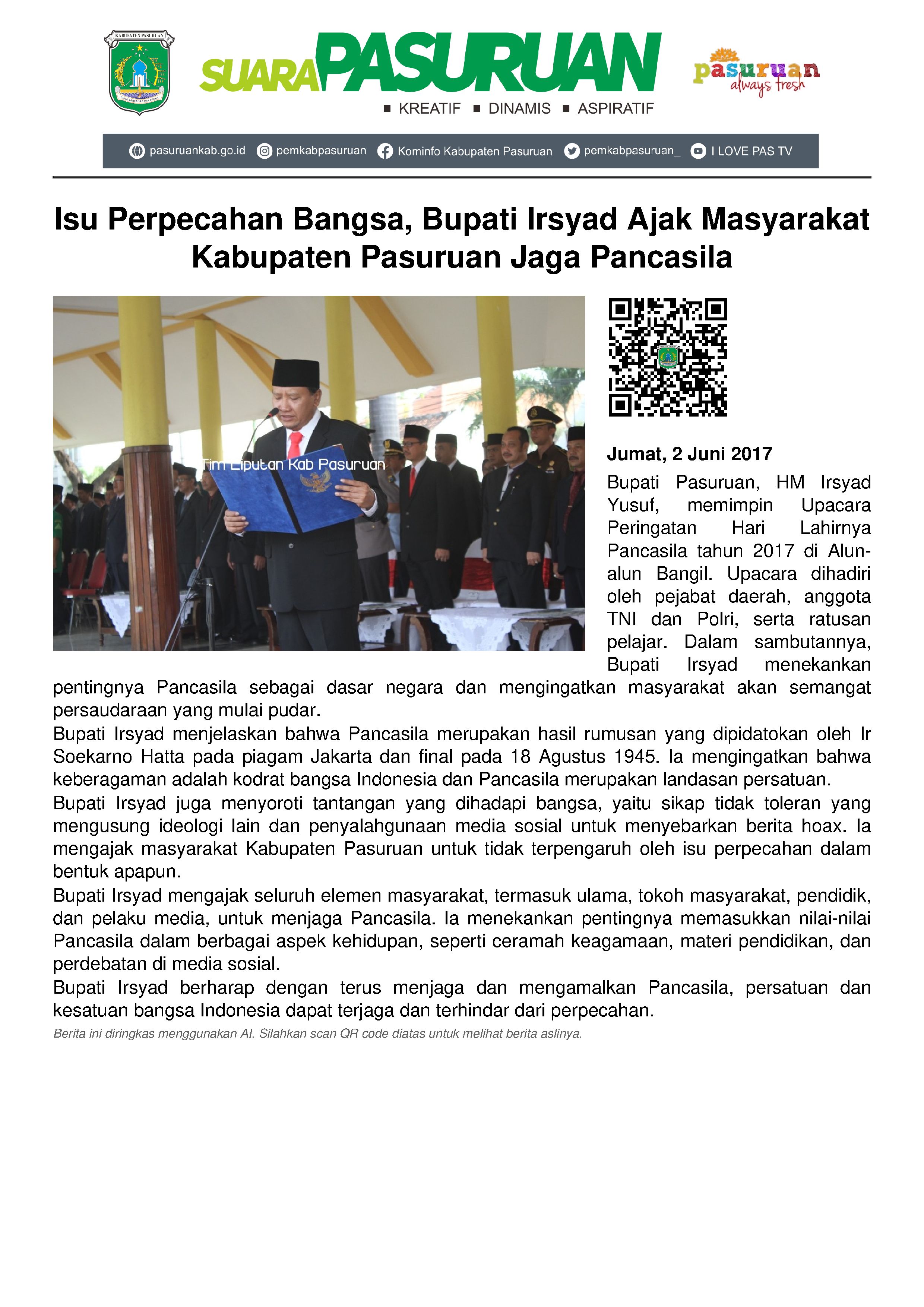 "Namun kehidupan berbangsa dan bernegara sedang mengalami tantangan. Ada sikap tidak toleran yang mengusung ideologi lain selain Pancasila. Masalah tersebut semakin mencemaskan tatkala diperparah oleh penyalahgunaan media sosial yang menyebarkan berita hoax. Untuk itu, saya mengajak seluruh masyarakat Kabupaten Pasuruan untuk tidak terpengaruh akan isu perpecahan dalam bentuk apapun," tegasnya.