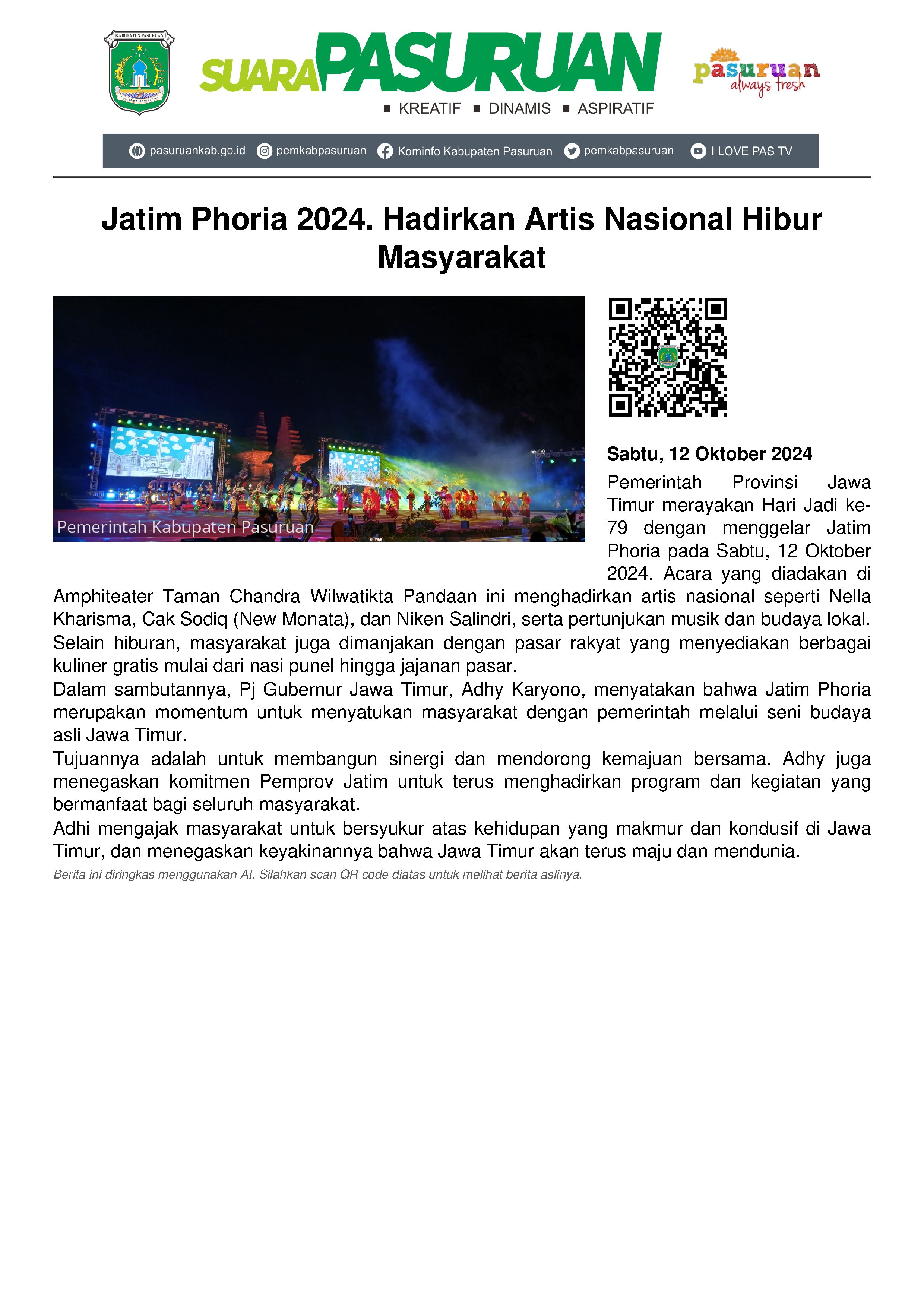 Memeriahkan Hari Jadi ke 79, Pemerintah Provinsi Jawa Timur menggelar Jatim Phoria, Sabtu (12/10/2024) malam.