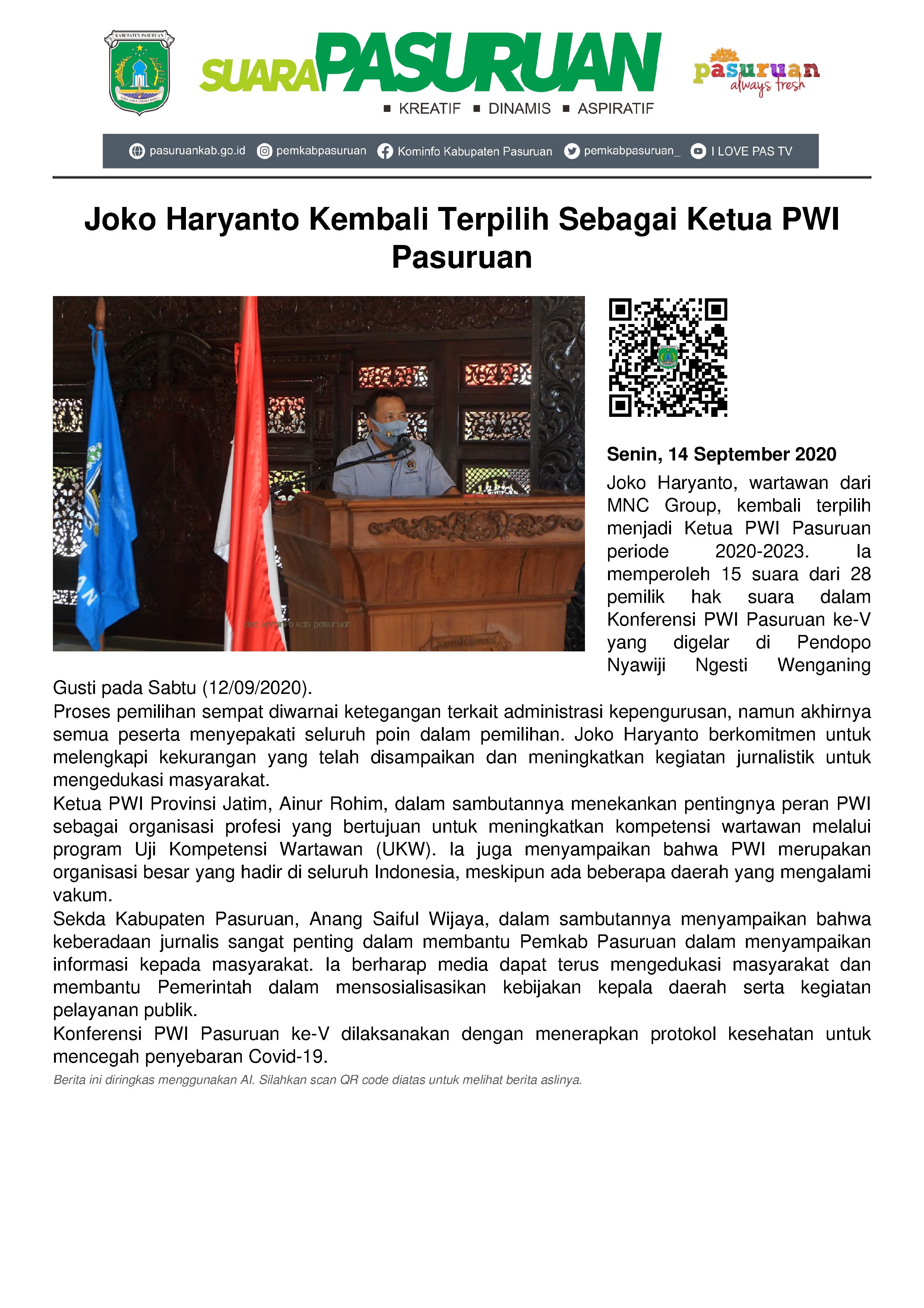 Terpilihnya Joko sebagai Ketua PWI Pasuruan hingga 2023 mendatang, setelah 15 suara yang hadir dalam Konferensi PWI Pasuruan ke-V, di Pendopo Nyawiji Ngesti Wenganing Gusti, Sabtu (12/09/2020) siang, memilihnya.