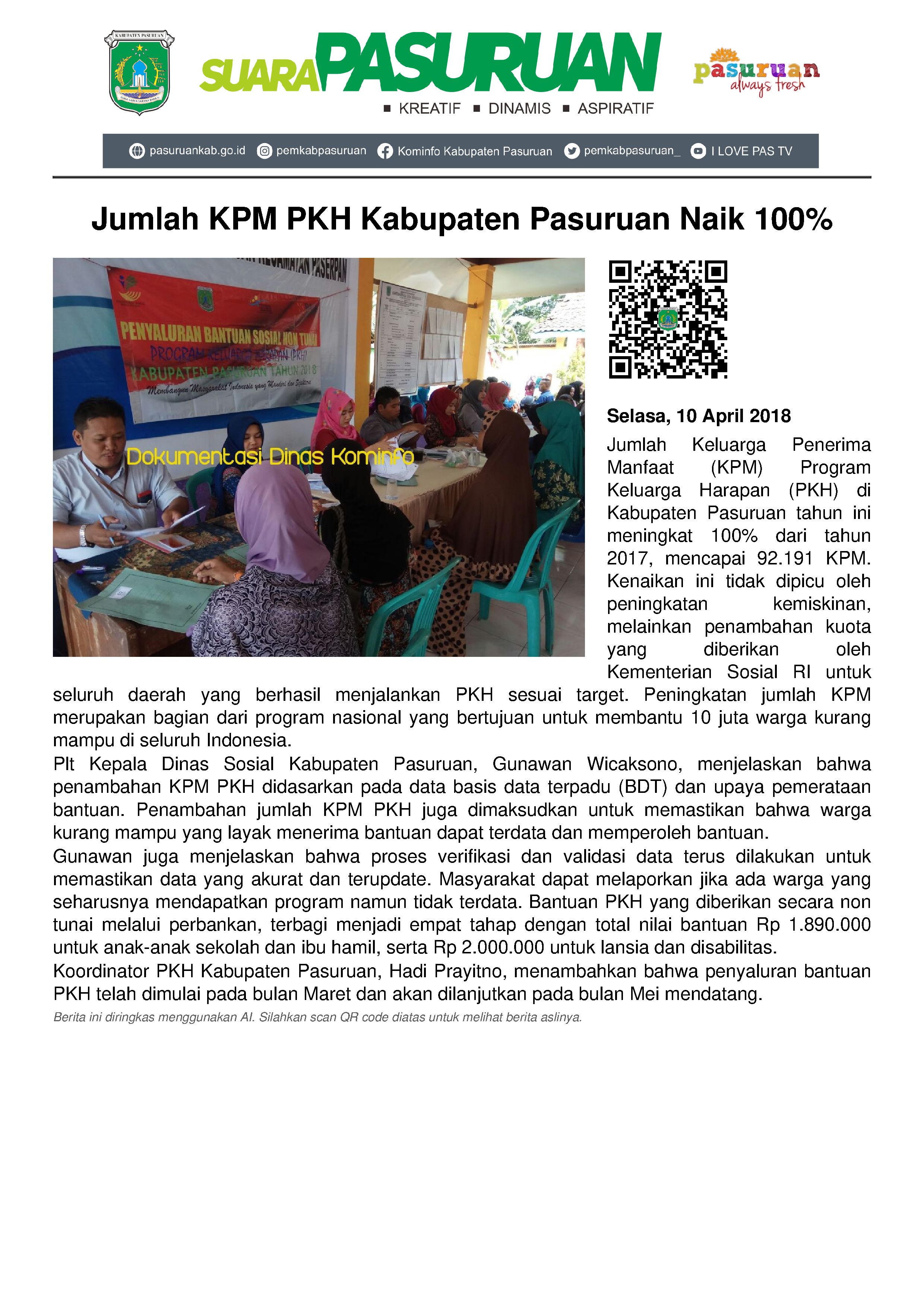 Jumlah Keluarga Penerima Manfaat (KPM) Program Keluarga Harapan (PKH) di Kabupaten Pasuruan tahun ini naik 100% dari tahun 2017, yakni dari 42.157 KPM menjadi 92.191 PKM.