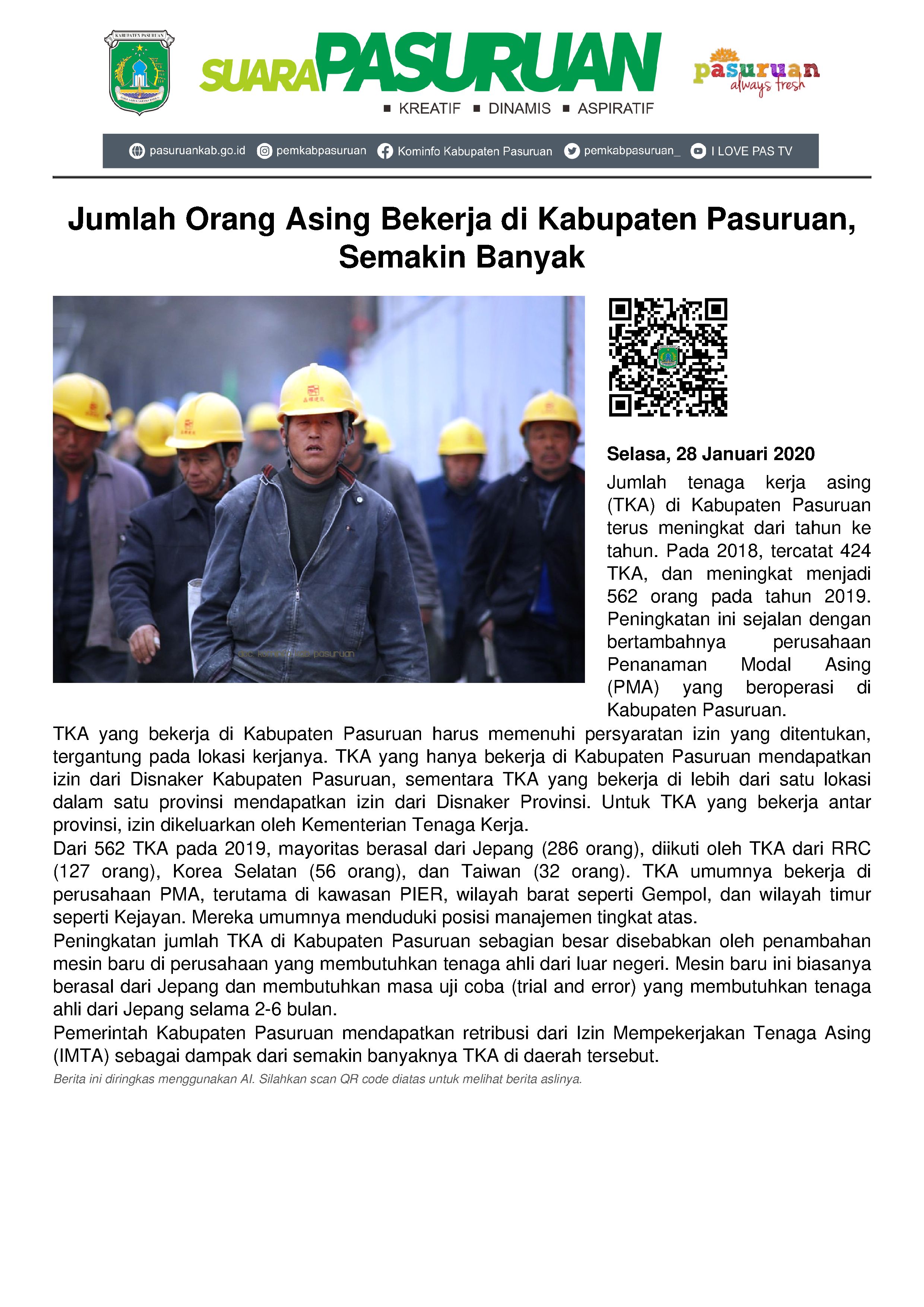 “Ya memang semakin banyak, seiring jumlah perusahaan PMA (Penanaman Modal Asing) yang baru dan menginvestasikan modalnya di Kabupaten Pasuruan,” katanya.