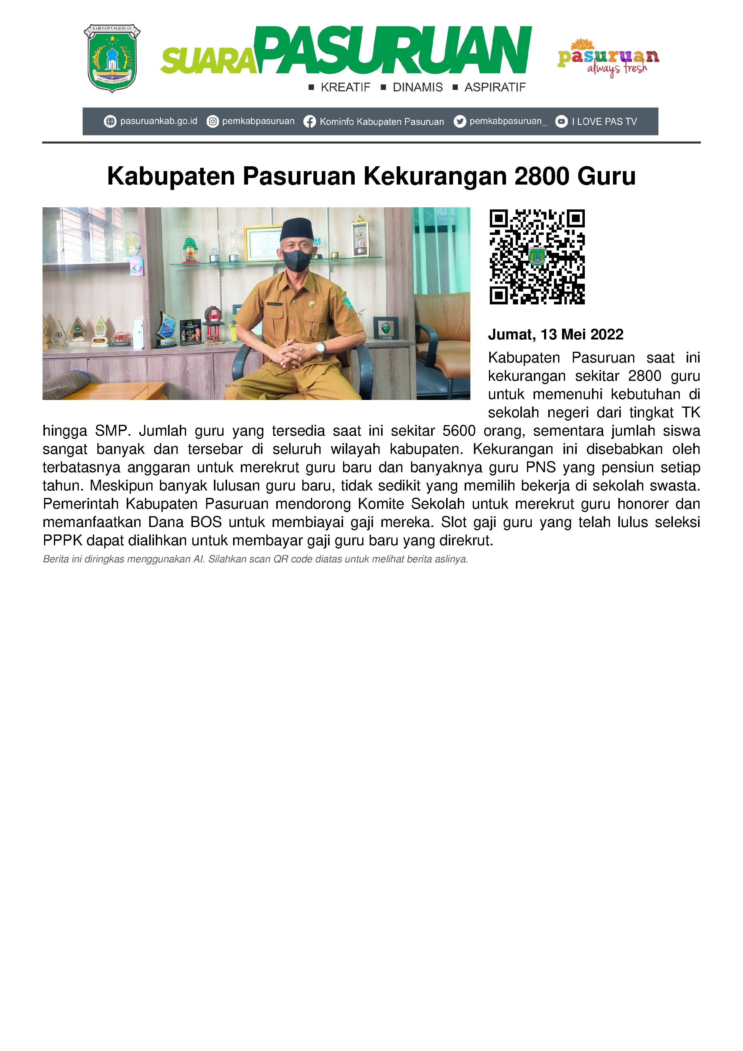 Kabupaten Pasuruan masih kekurangan guru.