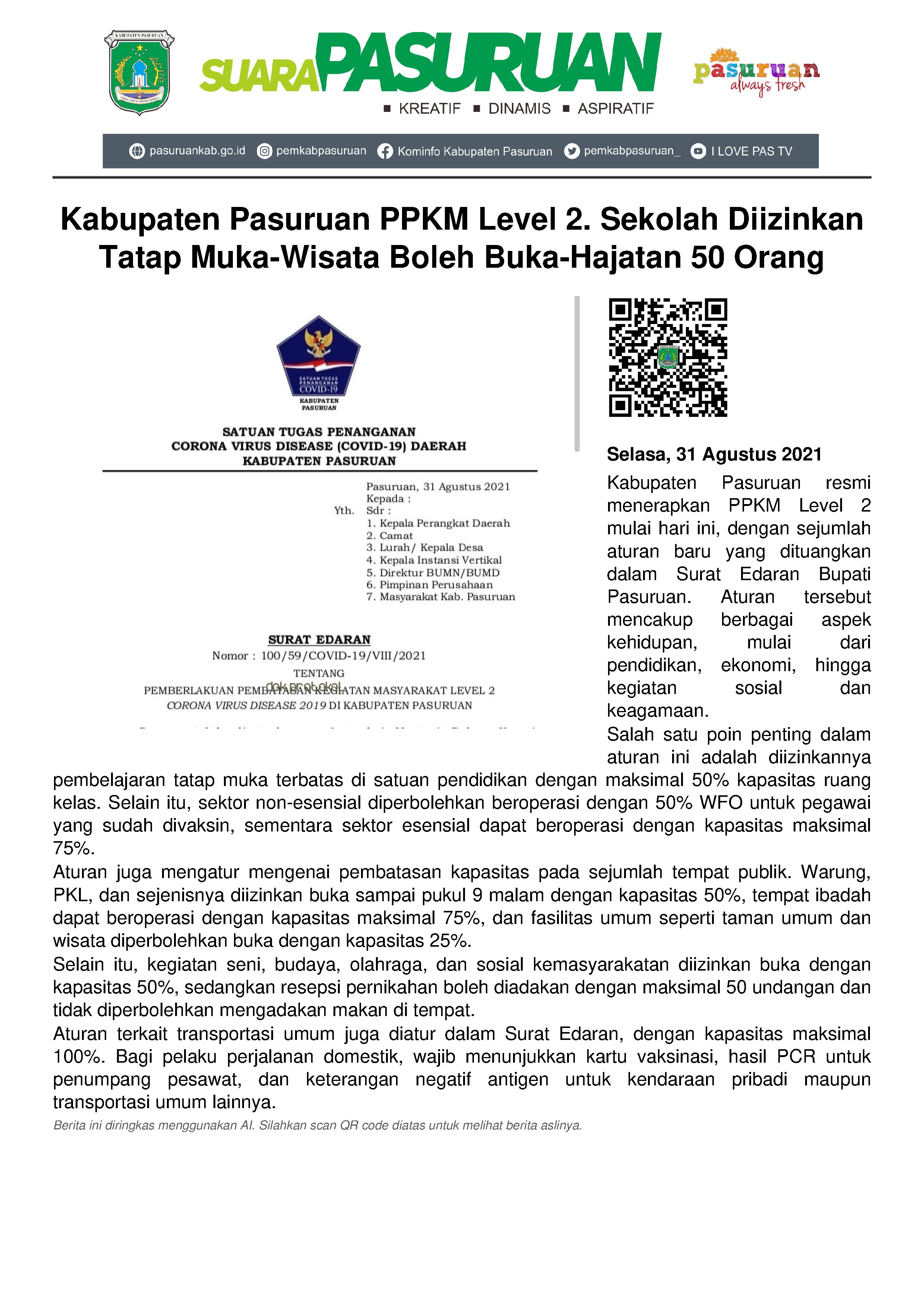 SE ini bernomor 100/59/COVID-19/VIII/2021 tentang PPKM Level 2 Covid-19 di Kabupaten Pasuruan sebagai tindak lanjut dari ditetapkannya Instruksi Menteri Dalam Negeri Nomor 38 Tahun 2021 tentang Pemberlakuan Pembatasan Kegiatan Masyarakat Level 4, Level 3 dan Level 2 Corona Virus Disease 2019 di Wilayah Jawa dan Bali.