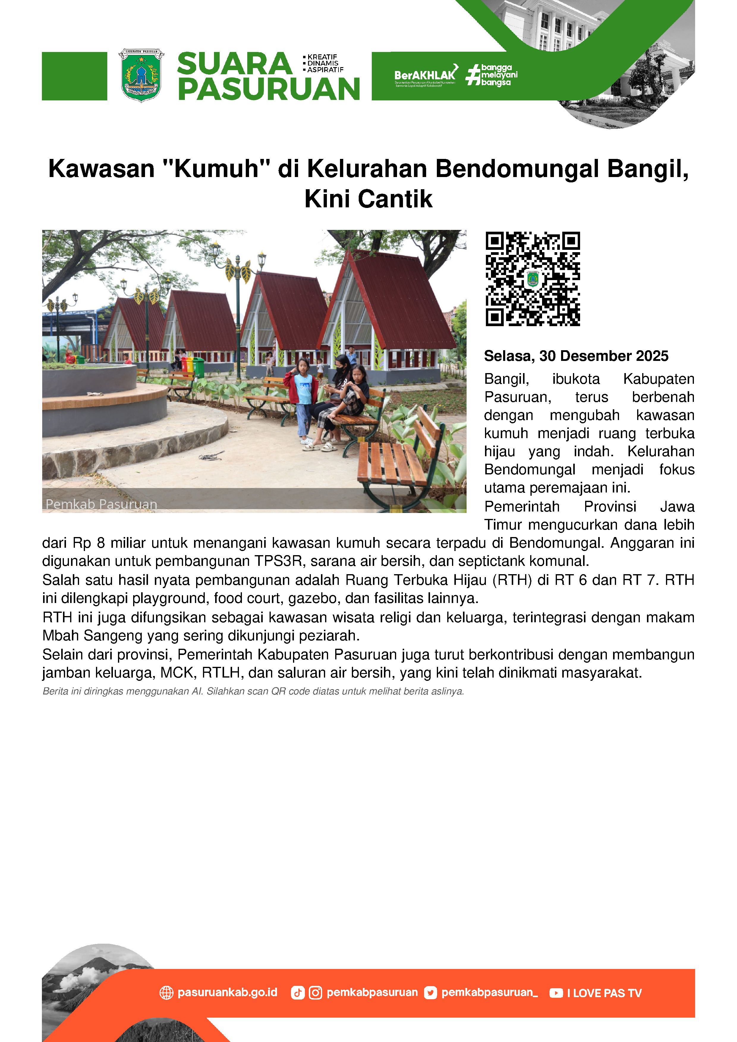 Selain dari Provinsi, Pemerintah Kabupaten Pasuruan melalui dinas perumahan dan kawasan permukiman juga telah menggelontorkan sejumlah anggaran. Kata Eko, APBD II digunakan untuk pembangunan jamban keluarga, MCK, RTLH dan saluran air bersih yang dibantu oleh Perumda Giri Nawa Tirta Kabupaten Pasuruan. Semuanya telah selesai dan dapat segera dinikmati oleh masyarakat.