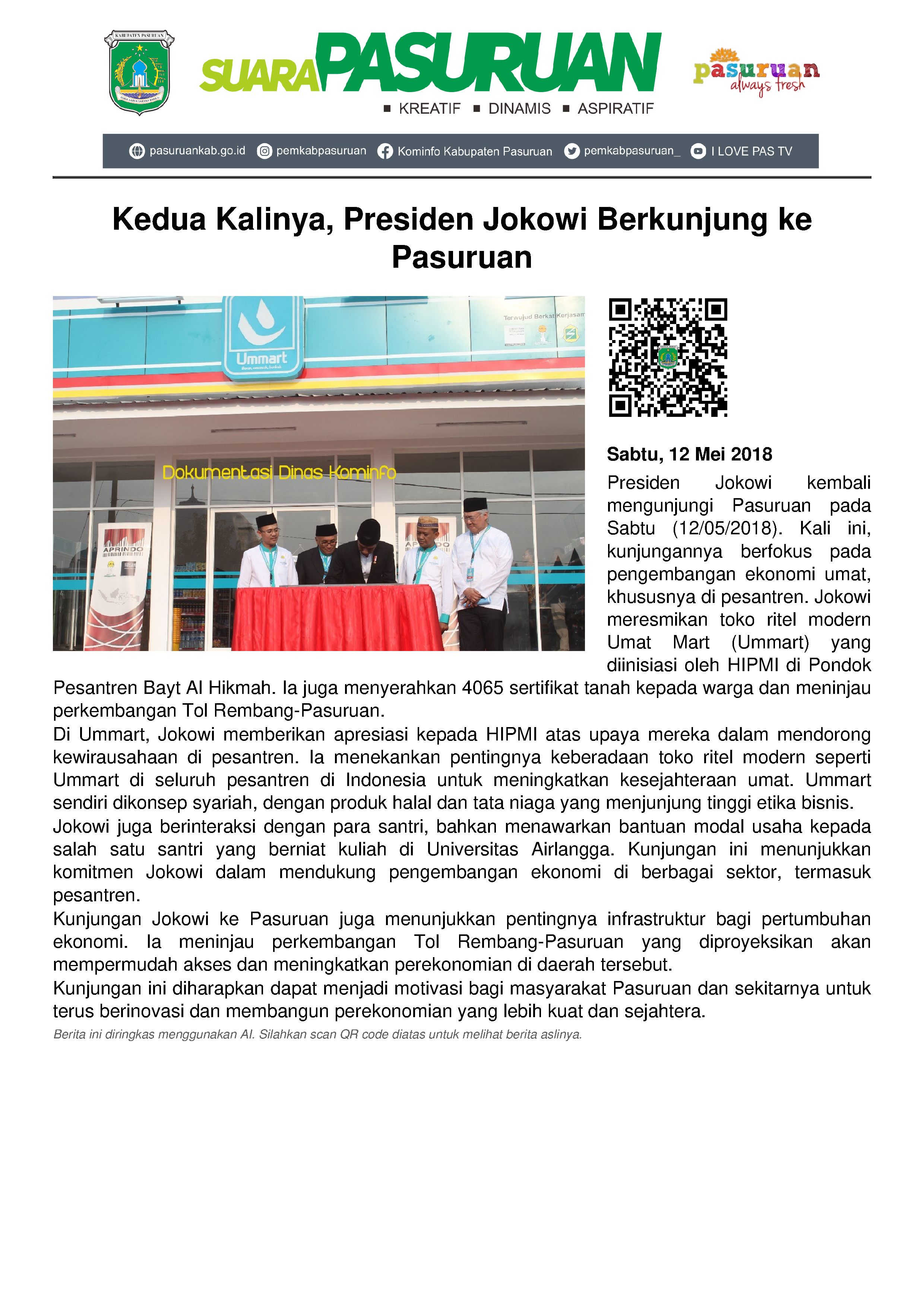 Kalau pada tahun 2015 lalu Jokowi datang untuk meresmikan Tol Gempol-Pandaan, kali ini orang nomor satu di negeri ini datang ke Pasuruan untuk meresmikan toko atau kios ritel modern Umat Mart atau Ummart yang diinisiasi oleh Himpunan Pengusaha Muda Indonesia (HIPMI) di Pondok Pesantren Bayt Al Hikmah, Krampyangan, Kota Pasuruan, kemudian menyerahkan 4065 sertifikat tanah untuk rayat di GOR Sasana Krida Anoraga, Raci Bangil, serta meninjau perkembangan Tol Rembang-Pasuruan.