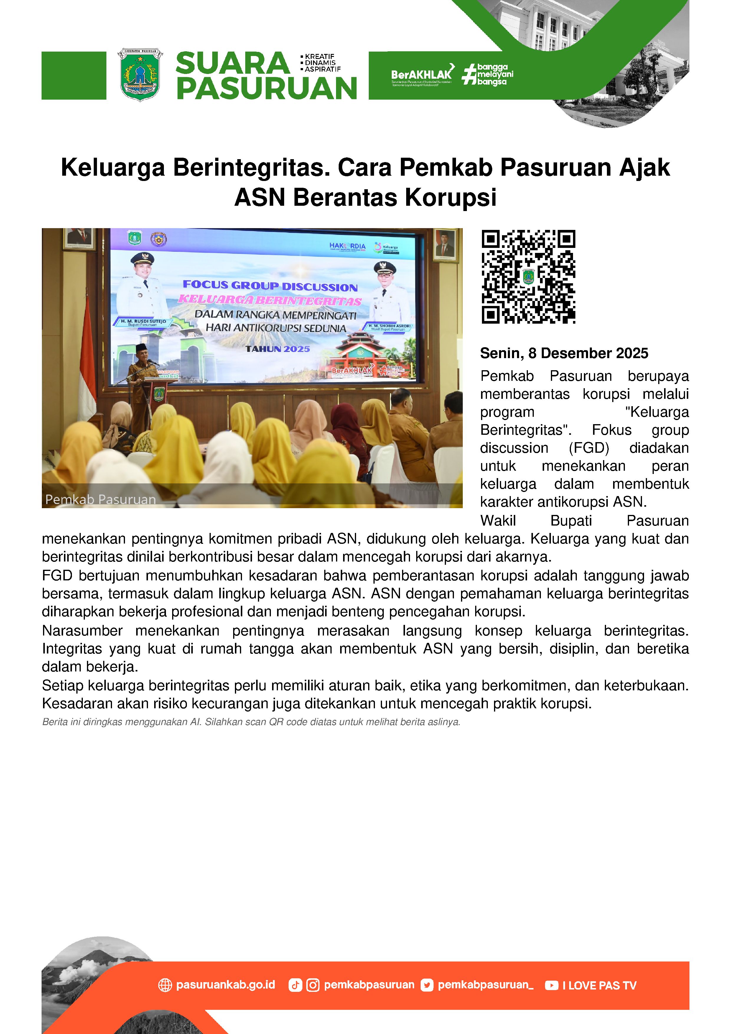 Salah satunya dengan penguatan "Keluarga Berintegritas". Peran keluarga sebagai benteng utama dalam membentuk karakter antikorupsi menjadi bahasan utama sekaligus poin penting yang disampaikan Wakil Bupati Pasuruan, Shobih Asrori saat membuka Focus Group Discussion di Auditorium Mpu Sindok, Komplek Kantor Bupati Pasuruan, Senin (8/12 2025).